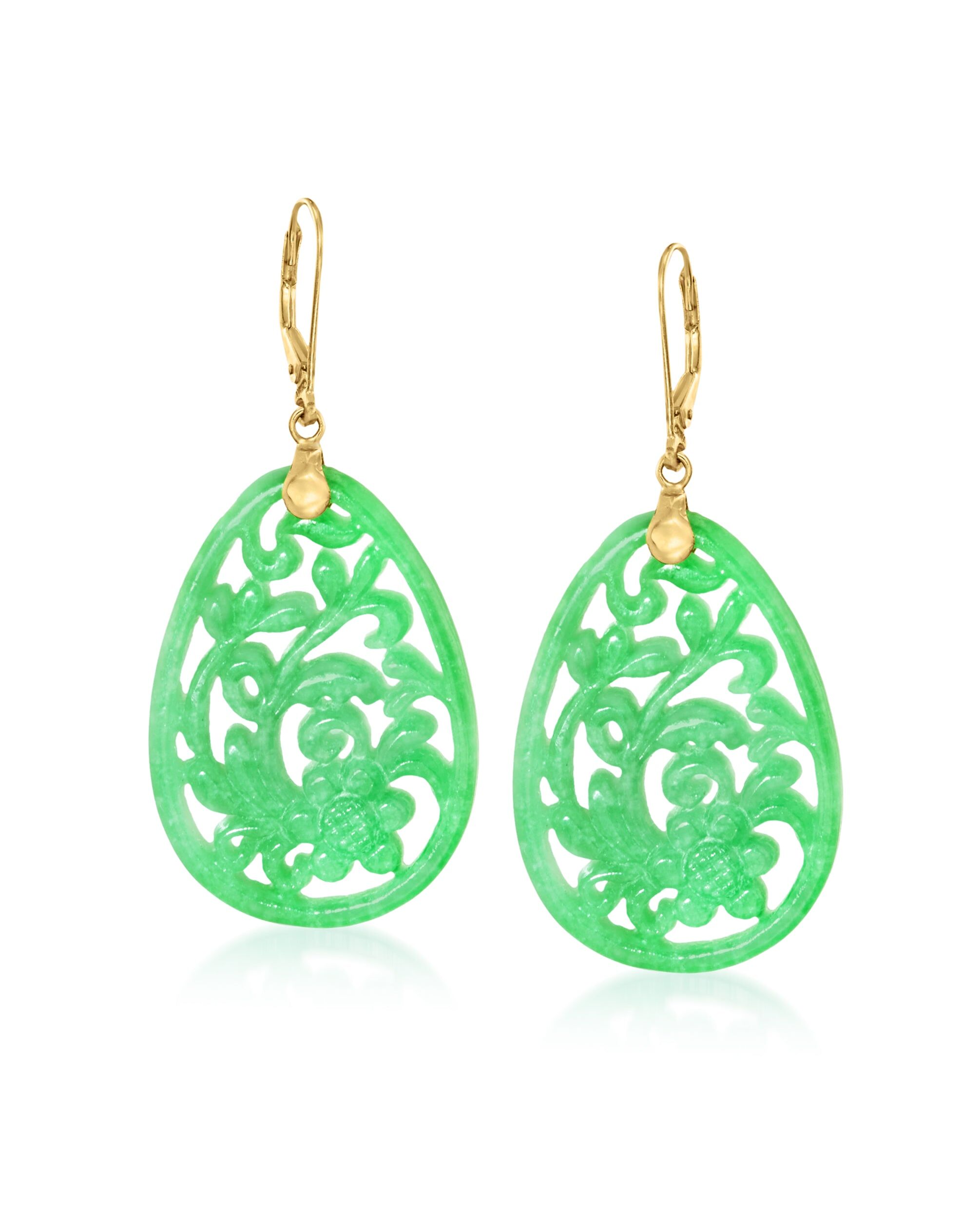 Ross-Simons Carved Jade Floral Drop Earrings in 14kt Yellow Gold
