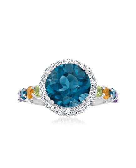 Established in 1952, Ross-Simons brings jewelry classics into the modern era. A sparkling rainbow awaits in this outstanding take on the traditional halo ring. A radiant 4.40 carat London blue topaz gem is framed by .50 ct. t.w. white topaz atop a sterling silver band lined with .30 ct. t.w. amethyst, citrine and peridot gems. 1/2" wide. London blue topaz ring. Each Ross-Simons item arrives in a fine jewelry presentation box. Shop Ross-Simons jewelry risk-free as all items include a 30-day, 100% money-back guarantee.Stone InformationGem Type 1 - AmethystStone Cut 1 - Good-CutStone Color 1 - Violet-BlueStone Clarity 1 - Violet-BlueStone Shape 1 - Round-ShapeStone Creation Method 1 - NaturalStone Treatment Method 1 - Heat-TreatedStone Weight 1 - 0.10 CaratsNumber Of Stones 1 - 2Gem Type 2 - CitrineStone Cut 2 - Good-CutStone Color 2 - YellowStone Clarity 2 - YellowStone Shape 2 - Round-ShapeStone Creation Method 2 - NaturalStone Treatment Method 2 - Heat-TreatedStone Weight 2 - 0.10 CaratsNumber Of Stones 2 - 2Gem Type 3 - PeridotStone Cut 3 - Good-CutStone Color 3 - GreenStone Clarity 3 - GreenStone Shape 3 - Round-ShapeStone Creation Method 3 - NaturalStone Treatment Method 3 - Not-TreatedStone Weight 3 - 0.10 CaratsNumber Of Stones 3 - 2Gem Type 4 - TopazStone Cut 4 - Good-CutStone Color 4 - BlueStone Clarity 4 - BlueStone Shape 4 - Round-ShapeStone Creation Method 4 - NaturalStone Treatment Method 4 - Heat-Treated,IrradiatedStone Weight 4 - 4.40 CaratsNumber Of Stones 4 - 3Gem Type 5 - TopazStone Cut 5 - Good-CutStone Color 5 - WhiteStone Clarity 5 - WhiteStone Shape 5 - Round-ShapeStone Creation Method 5 - NaturalStone Treatment Method 5 - Heat-Treated,IrradiatedStone Weight 5 - 0.50 CaratsNumber Of Stones 5 - 22