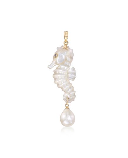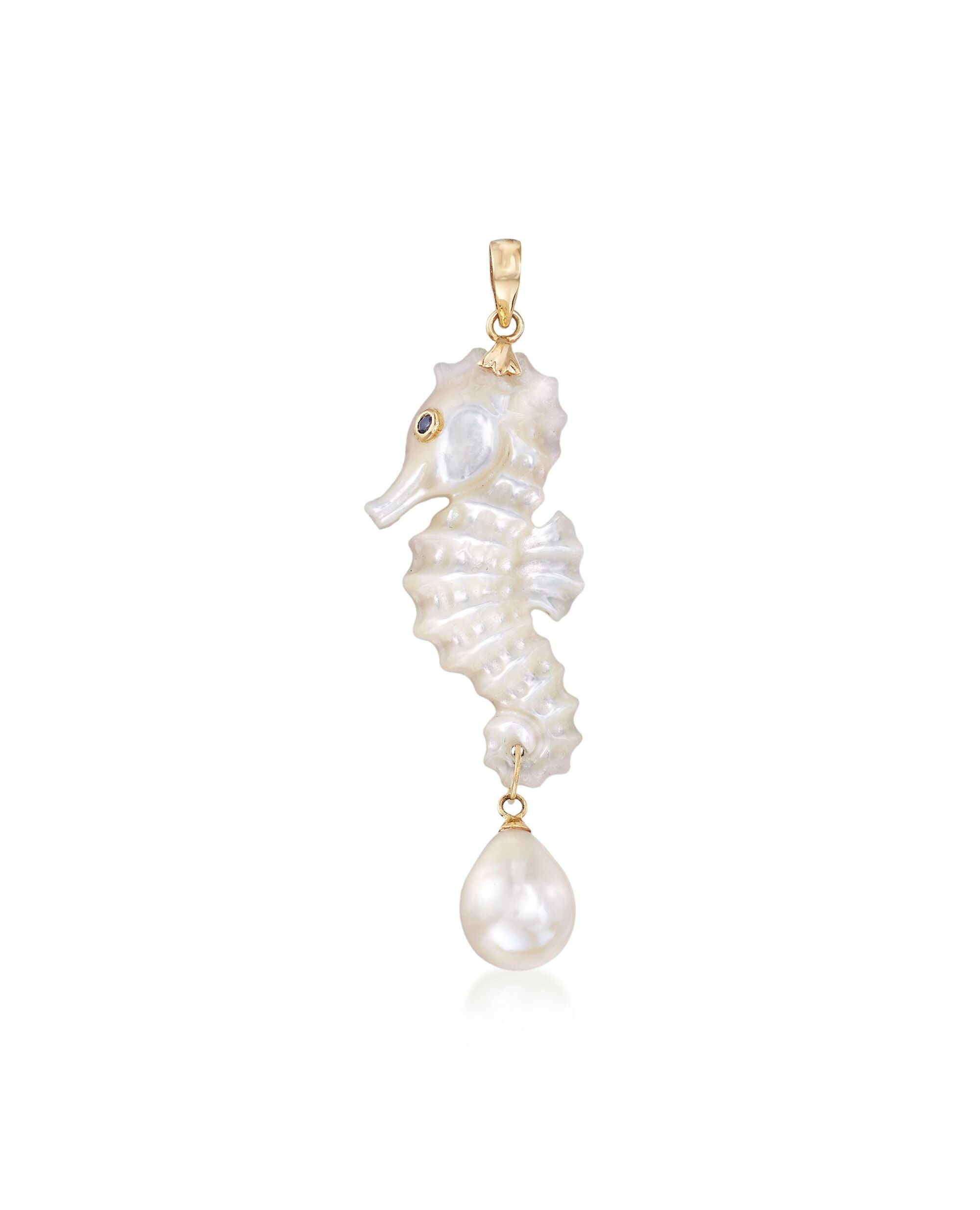 Ross-Simons is always looking for new ways to reinvent essential jewelry styles. A loyal guide through rough waters, the seahorse is a friend to all. Here, the poised creature is carved in great detail from dreamy 35x17mm mother-of-pearl, dangling a 9mm cultured freshwater pearl and flashing a sapphire-accented eye. Single bale fits chain up to 3mm, sold separately. Set in polished 14kt yellow gold. Seahorse white pearl and mother-of-pearl pendant. Each Ross-Simons item arrives in a fine jewelry presentation box. Shop Ross-Simons jewelry risk-free as all items include a 30-day, 100% money-back guarantee.Stone InformationGem Type 1 - Mother Of PearlStone Cut 1 - Good-CutStone Color 1 - WhiteStone Clarity 1 - WhiteStone Shape 1 - Special-Cut-ShapeStone Creation Method 1 - NaturalStone Treatment Method 1 - Dyed, CoatedStone Weight 1 - 0.00 CaratsNumber Of Stones 1 - 1Gem Type 2 - SapphireStone Cut 2 - Good-CutStone Color 2 - BlueStone Clarity 2 - BlueStone Shape 2 - Round-ShapeStone Creation Method 2 - NaturalStone Treatment Method 2 - HeatedStone Weight 2 - 0.05 CaratsNumber Of Stones 2 - 1Pearl InformationPearl Type 1 - Freshwater-CulturedPearl Minimum Color 1 - WhitePearl Lustre 1 - Medium-LusterPearl Shape 1 - TeardropPearl Uniformity 1 - GoodPearl Surface Blemishes 1 - Moderately BlemishedPearl Stringing Method 1 - Moderately BlemishedSize Per Pearl 1 - 9mmNumber Of Pearls 1 - 1