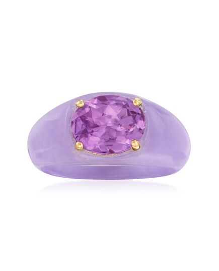 Established in 1952, Ross-Simons presents contemporary styles with a timeless appeal. Possess purple power with our mesmerizing ring. Carved lavender jade serves as the band and hosts a dazzling 3.00 carat oval amethyst at the center. Makes a perfect gift for the purple lover in your life. Features polished 14kt yellow gold prongs. 3/8" wide. Lavender jade and amethyst ring. Each Ross-Simons item arrives in a fine jewelry presentation box. Shop Ross-Simons jewelry risk-free as all items include a 30-day, 100% money-back guarantee.Stone InformationGem Type 1 - AmethystStone Cut 1 - Good-CutStone Color 1 - Violet-BlueStone Clarity 1 - Violet-BlueStone Shape 1 - Oval-ShapeStone Creation Method 1 - NaturalStone Treatment Method 1 - Heat-TreatedStone Weight 1 - 3.00 CaratsNumber Of Stones 1 - 1Gem Type 2 - JadeStone Cut 2 - Good-CutStone Color 2 - Blue-VioletStone Clarity 2 - Blue-VioletStone Shape 2 - Special-Cut-ShapeStone Creation Method 2 - NaturalStone Treatment Method 2 - Dyed, ImpregnatedStone Weight 2 - 0 CaratsNumber Of Stones 2 - 1