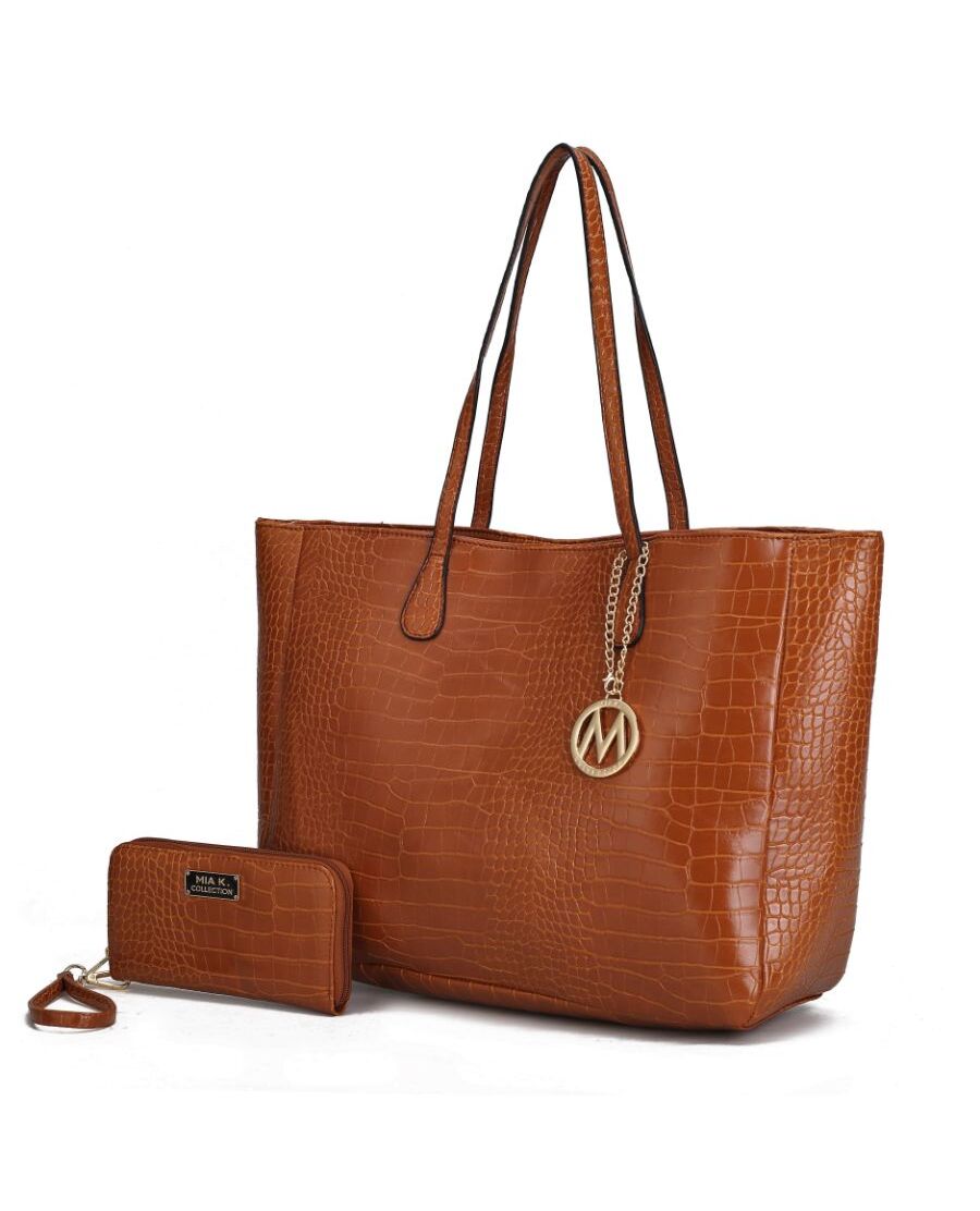 MATERIAL - Made of high-quality vegan leather Fabric lining FEATURE - Designed with luxurious gold tone hardware Removable MKF charm Embossed texture Magnetic snap top closure POCKETS - Interior features a spacious compartment with zippered pocket and slip in pockets MEASUREMENTS - 19 in L x 12 in H x 5 in D Wallet - 8in L X 4in H x 2in D Handle drop 10 in Adjustable shoulder strap extends to 48”in Wallet - 8” L x 4”H x 1” W