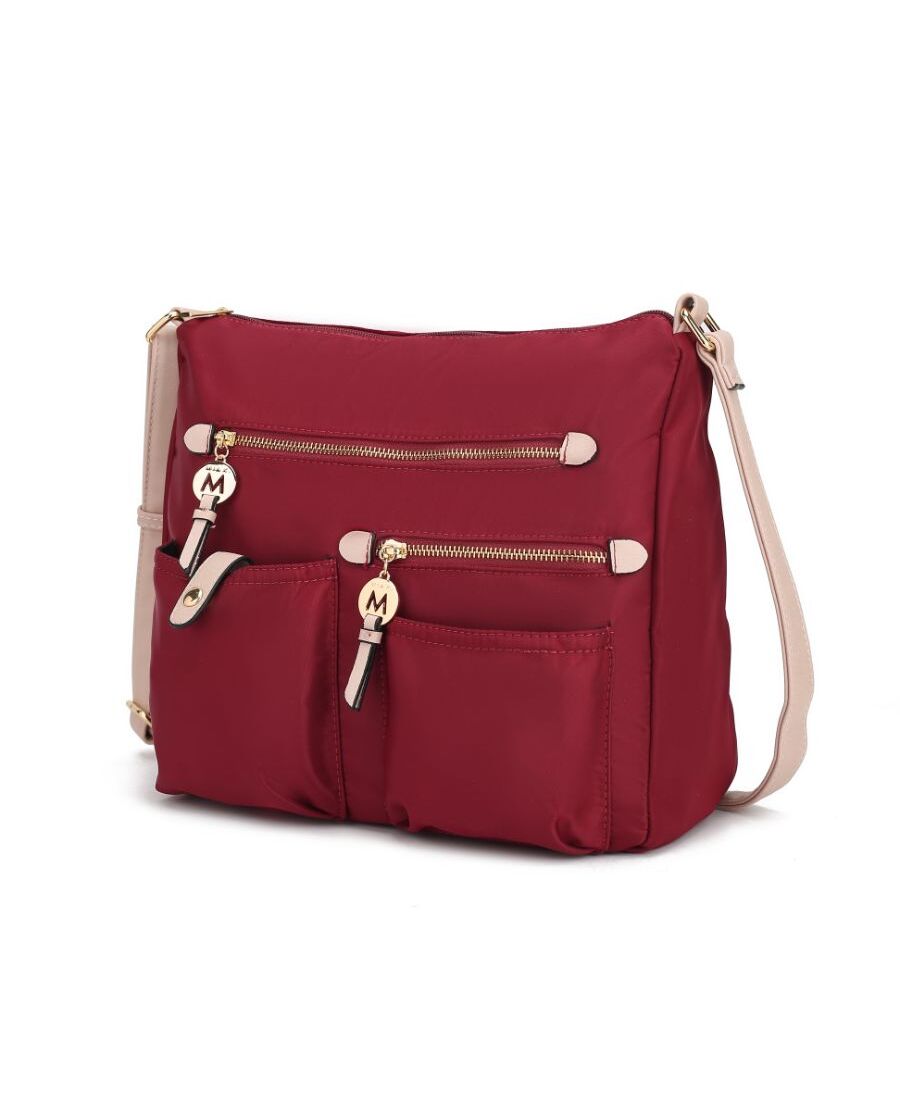 Feature - Design with luxurious gold tone embellishments, the Serena Shoulder Bag is a sophisticated yet street-chic style. Crafted from durable nylon material, with color-block trim in a smooth pebble vegan leather, the Serena Shoulder Bag is a modern take on the wardrobe icon. Unzips it to reveal a one-compartment fully lined interior with a slip pocket and a wall zippered pocket. The Serena Shoulder Bag has many convenient front pockets to keep all your belongings - two zippered pockets with our round medal emblem zipper puller, one slip pocket and a snap closure pocket. It has also a back zippered pocket. The Serena Shoulder has an adjustable strap for comfortable all-day wear. The Serena Shoulder bag has metal feet to keep bag upright position and has a semi structured silhouette. POCKETS - Interior features spacious compartment with two slip pockets and a wall zipper pocket. Exterior features a back deep zipper pocket. In the front, it has also two zipper pockets, and two slip pockets, one of them with a snap closure Measurements - 12 in L x 11.5 in H x 5 in W Adjustable shoulder strap extends to 23.5”