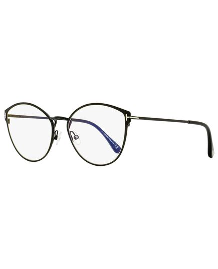 The Tom Ford 5573B Blue Block optical frames feature a butterfly lens shape and metal construction for women. These frames are ready-to-wear and include optical quality protective lenses that reduce risk of blue light and are ideal for use with digital devices. Iconic "T" metal accents complete the signature look. This model features a wide saddle bridge to provide an Alternative Fit; ideal for those with a less prominent nose bridge. Tom Ford is well known for its stunning designs and these optical frames are some of the most instantly recognizable in the world.Frame Material - Metal/PlasticFrame Color - Shiny BlackLens Color - ClearSize - 55-17-140Made in ItalyIncludes original case and cloth
