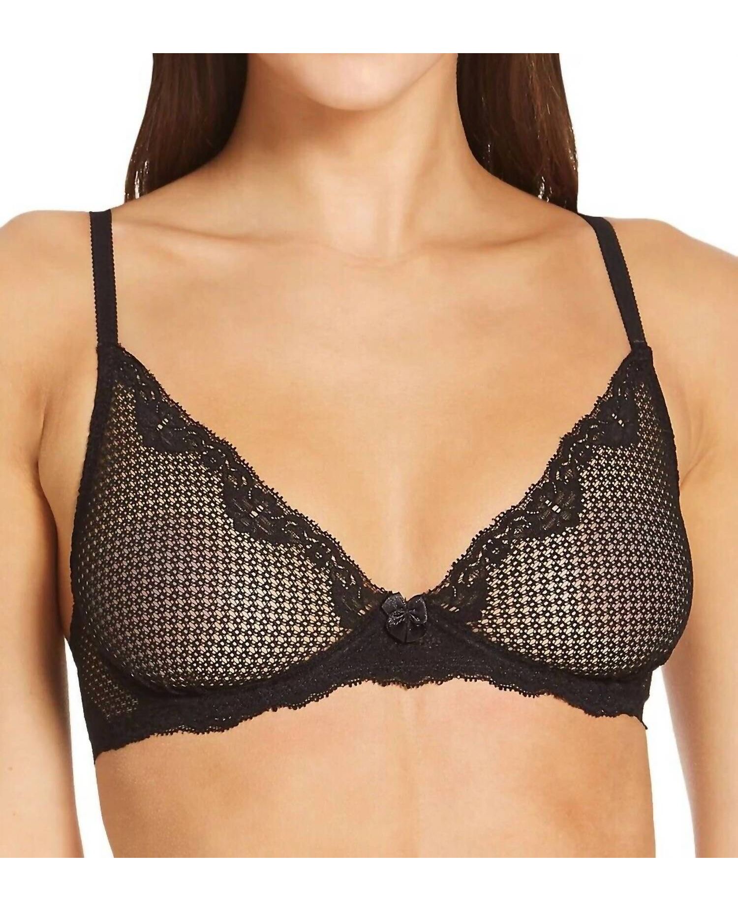 The most comfortable and stylish bra that you'll reach for daily.Underwired. Deep V plunging neckline. Seamless crochet lace demi cup with scalloped lace trim. Fully adjustable front straps. Satin bow at center front. Soft and stretch crochet lace with scalloped lace trim along the sides and back. Back closure with 2 rows and 3 adjustment levels. 83% polyamide 17% elastane.