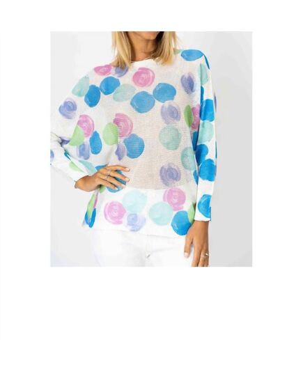 The ultimate go-to sweater, expertly crafted to provide the perfect combination of warmth and style. Its classic design and soft fabric make it a must-have addition to your wardrobe.Multi-colored dots batwing sweater with a boat neckline and long sleeves. Features an open weave design and tunic length. Relaxed fit, one size fits most. Made from 70% polyester and 30% acrylic. Made in Italy.