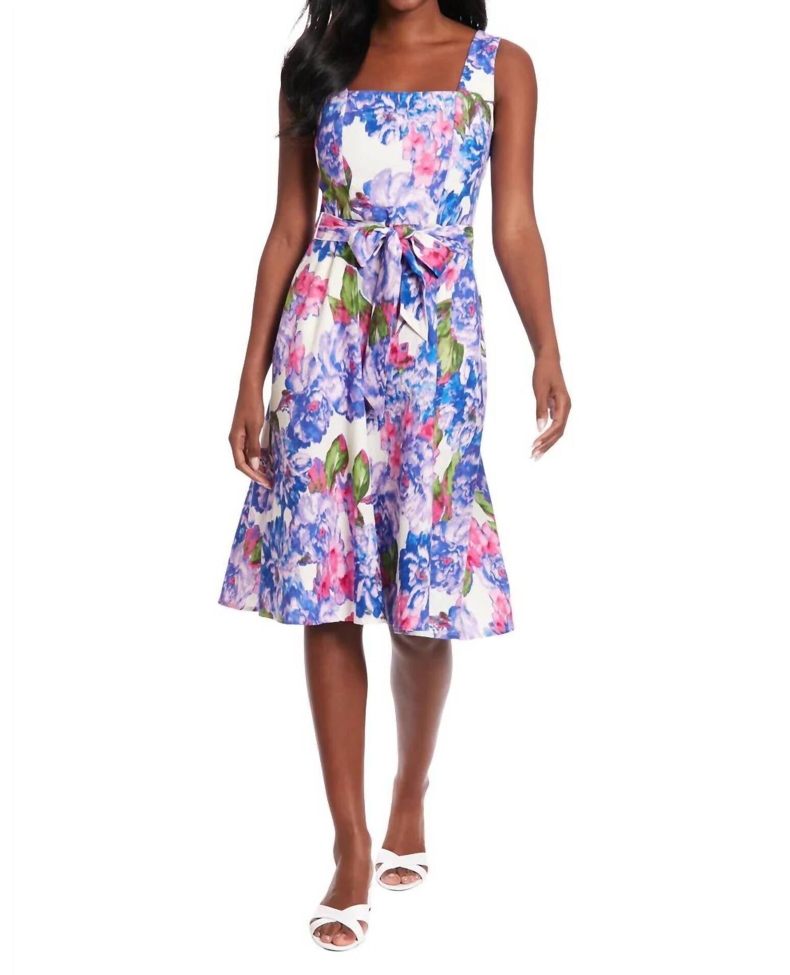 Just add slides or mules and you are good to go.Floral print short dress with a square neckline and sleeveless design. Features a self-tie belt, lined interior, and pockets. Made from 55% linen and 45% rayon. Machine wash cold.