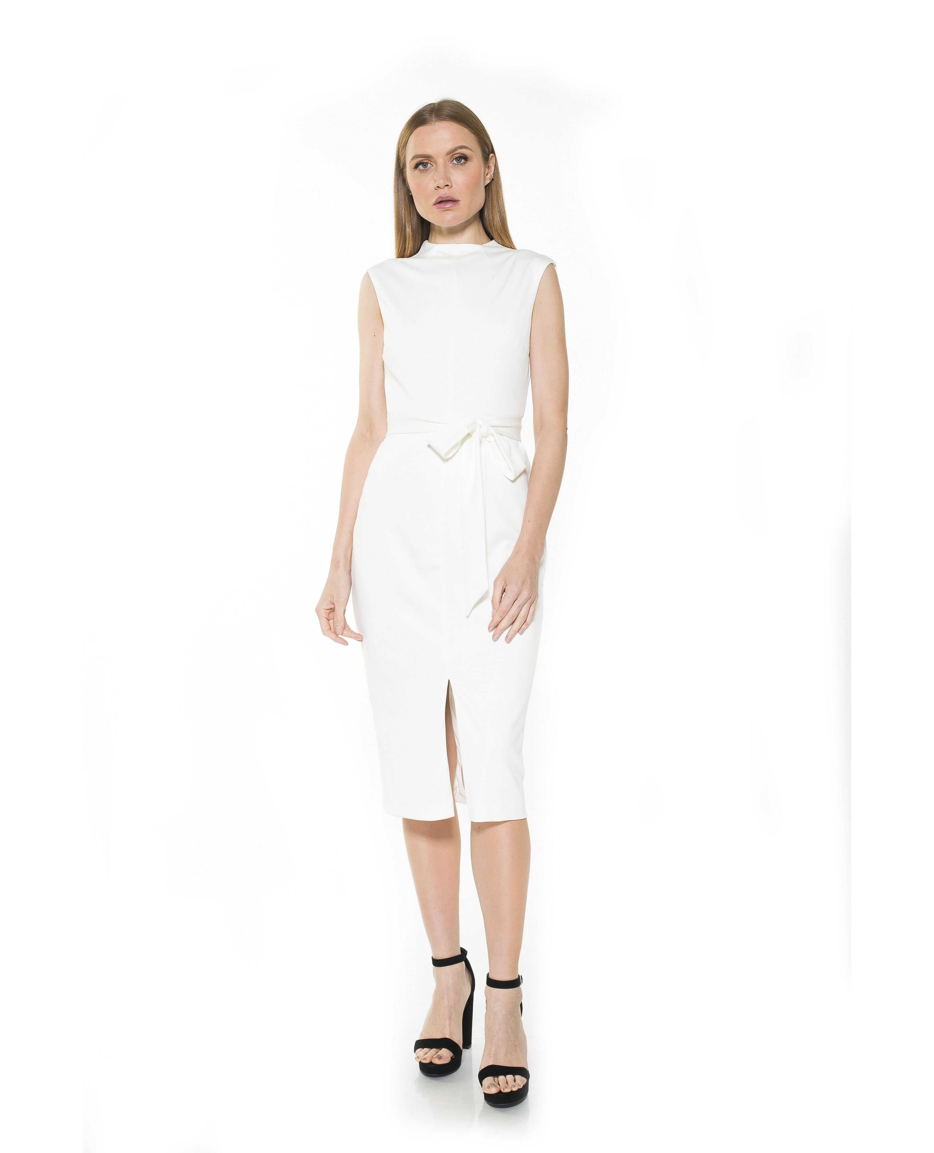 PRODUCT FEATURES High neckline Sleeveless design Tie waistband for a custom fit Front slit Below the knee length 95% Polyester, 5% Spandex Lined - 100% Polyester Machine wash cold, tumble dry low. Style D3517