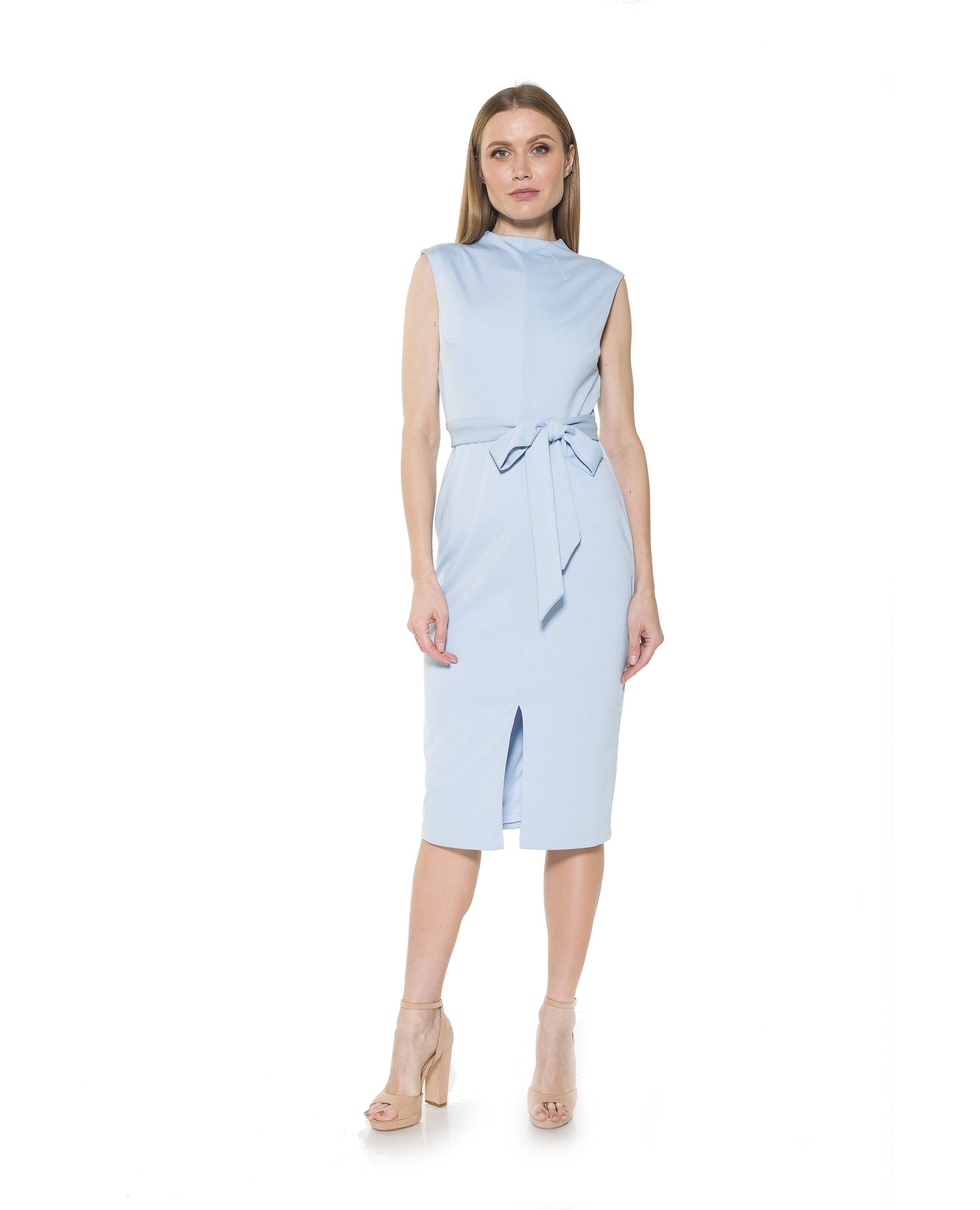 PRODUCT FEATURES High neckline Sleeveless design Tie waistband for a custom fit Front slit Below the knee length 95% Polyester, 5% Spandex Lined - 100% Polyester Machine wash cold, tumble dry low. Style D3517