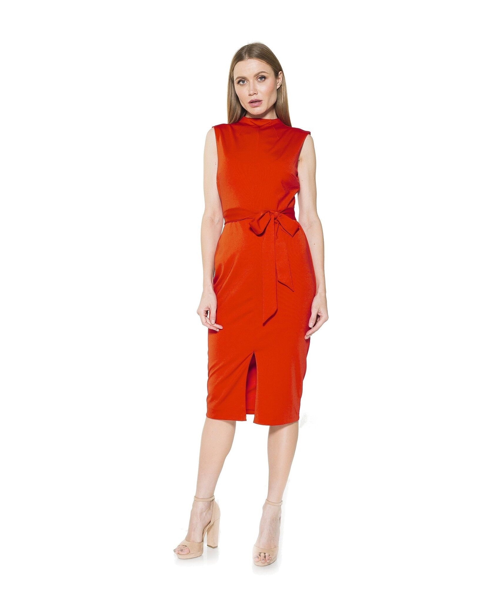 PRODUCT FEATURES High neckline Sleeveless design Tie waistband for a custom fit Front slit Below the knee length 95% Polyester, 5% Spandex Lined - 100% Polyester Machine wash cold, tumble dry low. Style D3517