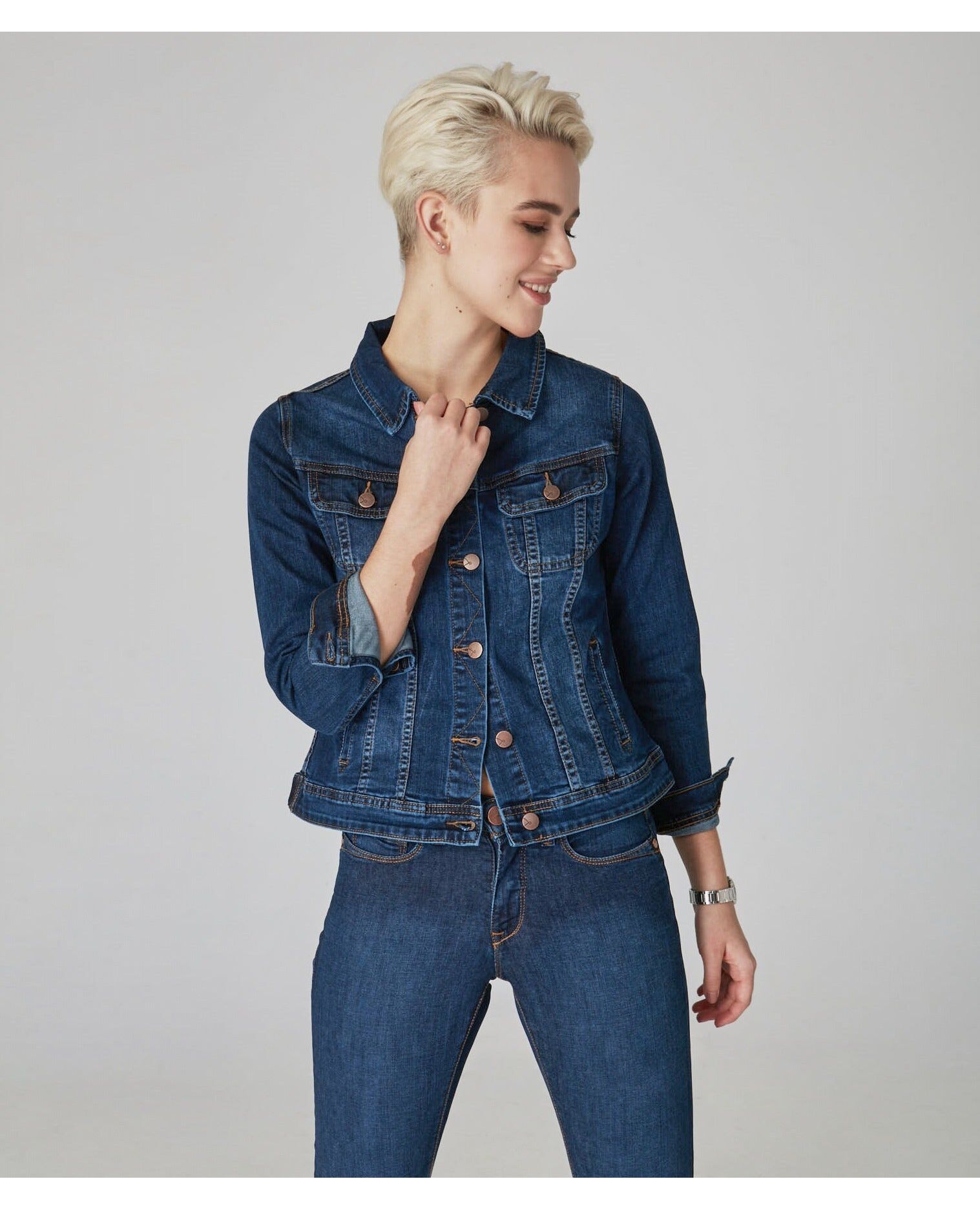 The Gabriella is a classic constructed denim jacket. This essential piece combines authentic details with clean styling. Wear it over anything from sweaters to tees. Classic Denim JacketCool Starry NightStretch Denim62% Cotton 17% Polyester 19% Viscose 2% SpandexMachine Wash / Tumble dryTrue to size Model is 5'10" Tall / Wearing a size S