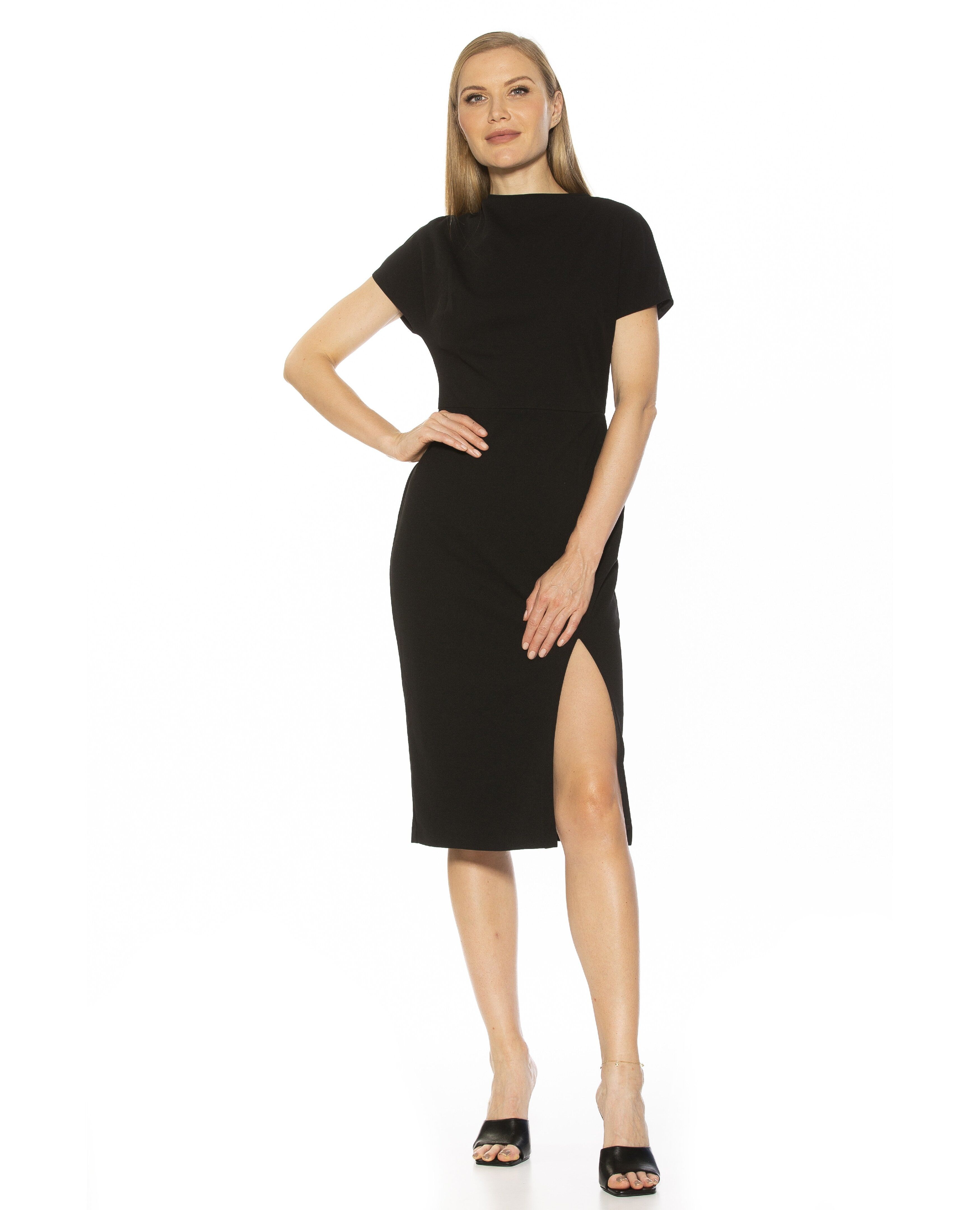 PRODUCT FEATURES Mock neck?� Leg slit Midi dress 95% Polyester, 5% Spandex Lining - 100% Polyester Machine Wash Imported Style D3952