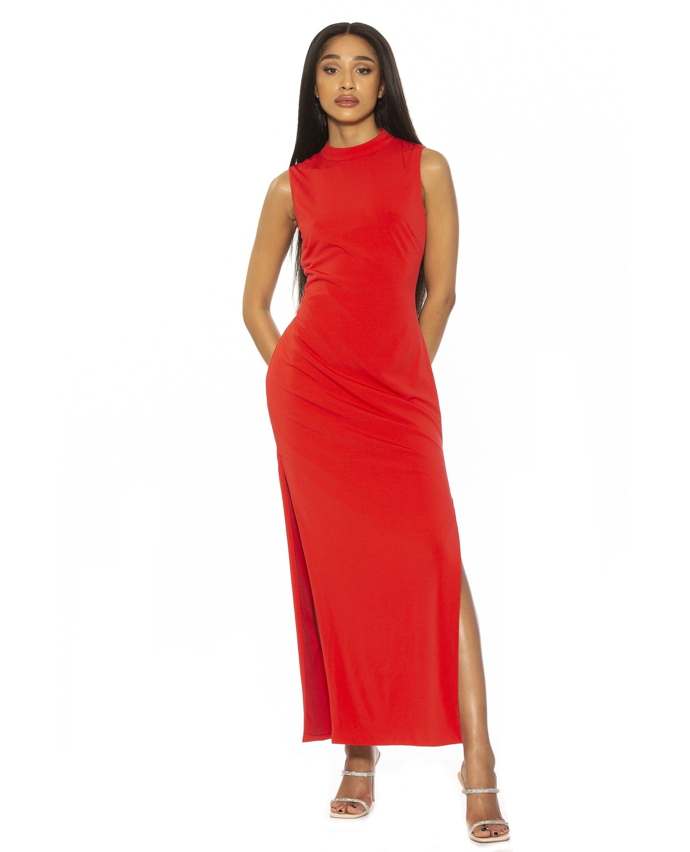 Sleeves are cancelled. The Violet is a sleeveless, maxi dress with a mock neckline, and an open back with a tie detail.PRODUCT FEATURES Mock neck?� Sleevless Back tie?� Back Cutout?� High Leg Slit?� Maxi Dress 95% Polyester, 5% Spandex Lining - 100% Polyester Machine Wash Imported Style D3987