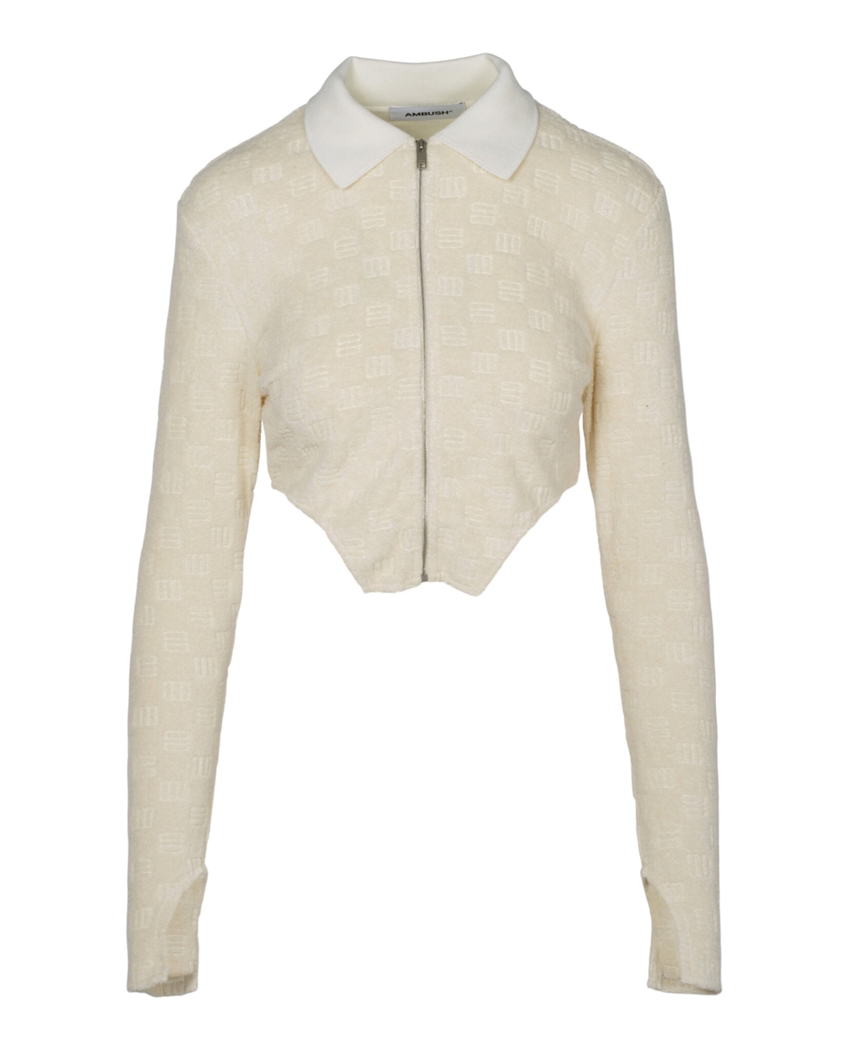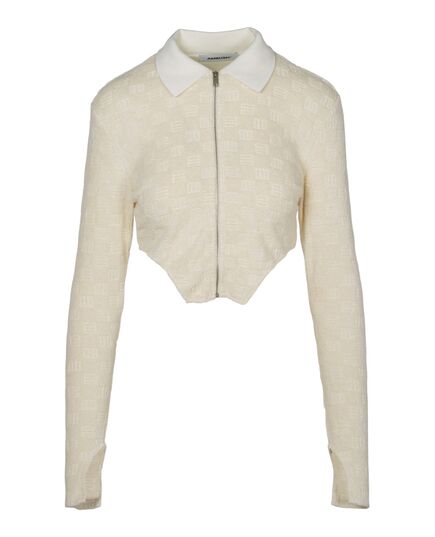 DETAILS Zip up front closure Collared neckline Classic collar Regular fit Monogram jacquard printed; Cutout detailing at the hem and cuffs Machine wash Main - 79% Cotton, 21% Polyamide; Contrast - 100% Cotton Made in Italy
