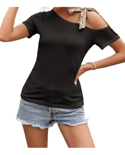 A timeless blouse that will never go out of style.Stunning black blouse. Featuring an alluring off-the-shoulder neckline. Accentuates your collarbones and shoulders perfectly. Crafted from a blend of 60% Polyester, 35% Cotton, and 5% Spandex. Provides a comfortable and stretchy fit. Striking animal print at the strap tie. Short sleeves to keep you cool and a pull-on closure for easy dressing. As practical as it is stylish.