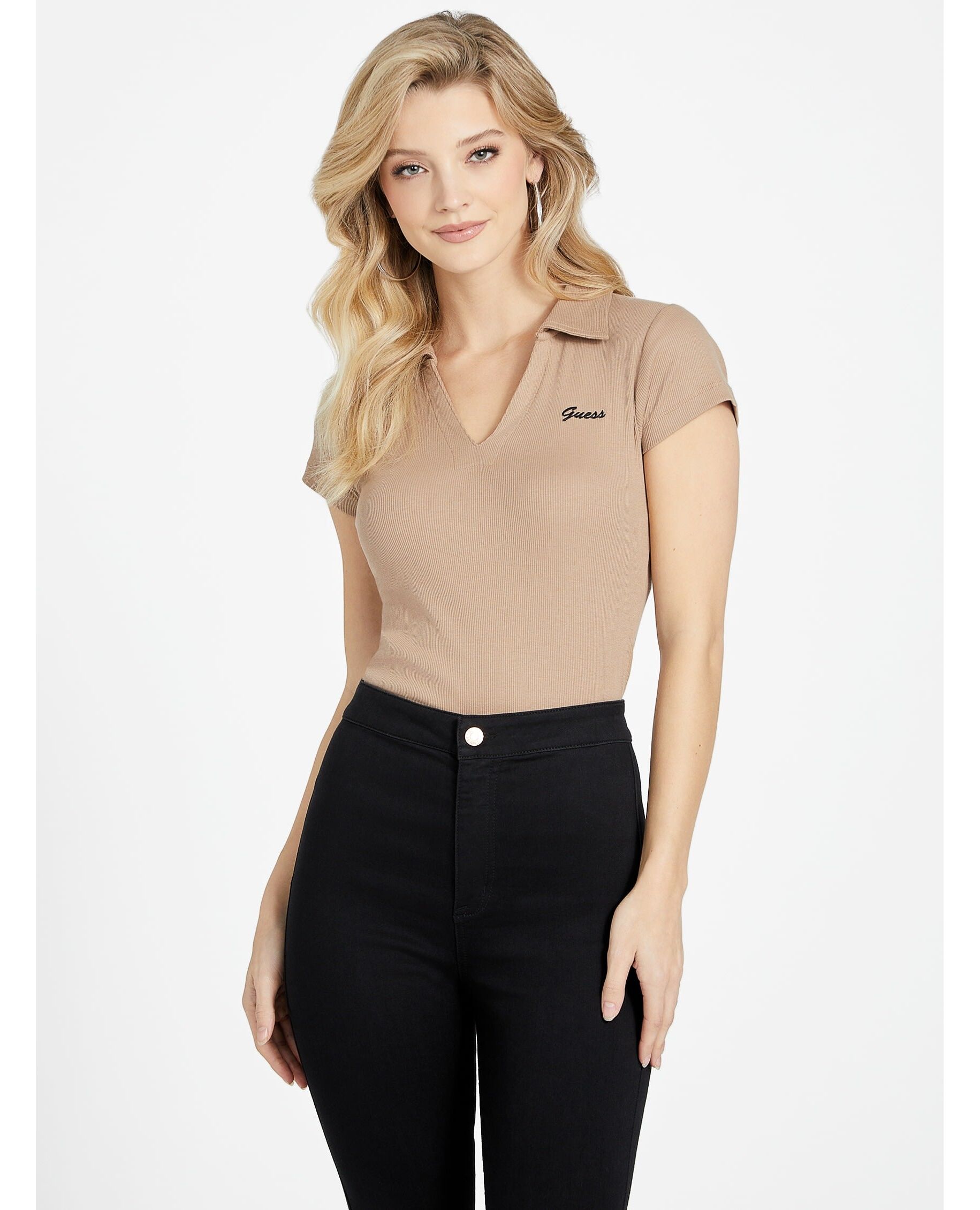 Always a classic look, this polo top features a V-neckline, pointed collar and embroidered logo text.