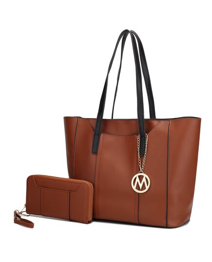 MATERIAL - Made of high-quality vegan leatherFEATURE - Designed with luxurious gold tone hardwareZip top closureContrast piping designRemovable signature M keychainSoft pebbled textureLightweightPOCKETS - Interior features an open spacious compartment with a deep wall zippered pocket and hidden slip in pocket to fit larger phonesExterior features hidden front slip in pocket and a generous back slip in pocket can fit a tablet or an iPadMEASUREMENTS - 17 in W x 10.5 in H x 5.5 in DHandle Drop 10 inWallet MEASUREMENTS - 8 in W x 4 in H x 0.5 in DFEATURE - Designed with luxurious gold tone embellishmentsPOCKETS - Interior features 12 card slots, 2 full bill compartments, a-mid centered zipper pocketExterior features back zippered pocketRemovable wristlet strap 7in