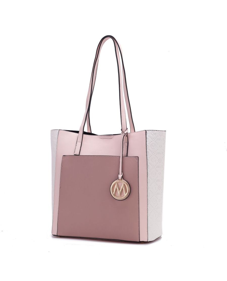 The Leah Color Block Tote bag is a striking fashion statement. Crafted from high-quality vegan leather, it features contrasting blocks of colors strategically arranged, creating a visually appealing and modern look. This design adds a pop of vibrancy and character to the bag, in addition to our embossed Mia K pattern.A magnetic snap closure ensures your belongings stay safe and prevents them from falling out. The Leah Tote is spacious and practical for everyday use. It’s designed to comfortably accommodate a range of essentials, such as laptop, books, a wallet, a phone, and other personal items. The interior features a secure zip compartment for valuables.The Tote Bag is equipped with sturdy top handles, allowing easy hand-carrying.It has flat base and protective metal feet on the bottom.The exterior features a deep front slip pocket.The Leah Tote Bag is a statement piece that combines aesthetics, functionally, and sustainability. POCKETS - Interior features a zippered pocket compartment. The exterior features a convenient front slip pocket.Measurements - 11.8 in L x 11.4 in H x 4.7 in DHandle drop - 11”