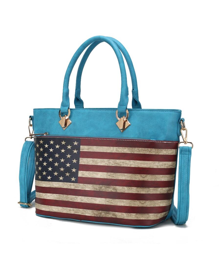 Our Lilian carryall is the ultimate tote bag for everyday wear. Rendered in a printed patriotic pattern in a high-quality vegan leather, this one-compartment bag is designed to stow all you need for a busy day. Unzips the bag to reveal a printed lined interior with a wall zippered pocket and slip pockets for all your daily essentials. Designed with gold-tone embellishments, the Lilian Tote Bag has a soft structured silhouette with flat base for stability and protective metal feet. Carry it by the smooth top handles or if the mood strikes, attach the adjustable crossbody strap The Lilian Tote Bag is the perfect companion for any outing with the array of organizational features.POCKETS - Interior features a wall zip pocket and two slip pockets. The exterior features one back zip pocket.Measurements - 11.8” W x 9.45” H x 6” DHandle Drop - 6.3”Attachable and adjustable strap - Extends to 23”