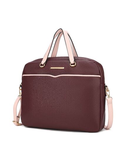 Beautifully crafted with top-grain Saffiano vegan leather, the Rose Briefcase is a sleek document case, with a catchy lining to accentuate the boldness of modern women. Spacious compartments are thoughtfully designed for stylish professionals to organize your business necessities effortlessly. The Rose Briefcase features top handles and a removable and adjustable crossbody strap for versatile carrying options, while the lined interior provides a padded compartment for a laptop, a business card pocket, two slip pockets, and a wall zippered pocket. The top zipper closure will keep your items secure all day. The Rose Briefcase is the lightweight bag that you need to carry to your next out-of-office meeting.POCKETS - Interior features a padded compartment for laptop, a wall zip pocket, a business card pocket and two slip pockets. Exterior features one zippered back pocketMeasurements - 15” W x 12” H x 3.5” D