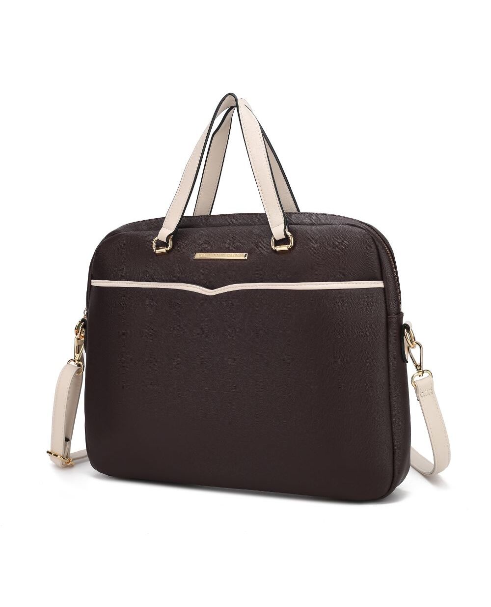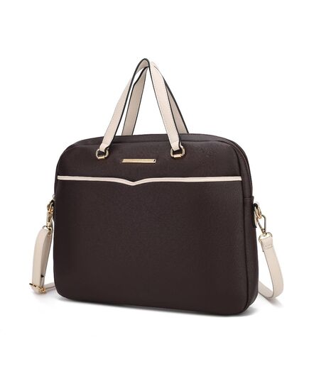 Beautifully crafted with top-grain Saffiano vegan leather, the Rose Briefcase is a sleek document case, with a catchy lining to accentuate the boldness of modern women. Spacious compartments are thoughtfully designed for stylish professionals to organize your business necessities effortlessly. The Rose Briefcase features top handles and a removable and adjustable crossbody strap for versatile carrying options, while the lined interior provides a padded compartment for a laptop, a business card pocket, two slip pockets, and a wall zippered pocket. The top zipper closure will keep your items secure all day. The Rose Briefcase is the lightweight bag that you need to carry to your next out-of-office meeting.POCKETS - Interior features a padded compartment for laptop, a wall zip pocket, a business card pocket and two slip pockets. Exterior features one zippered back pocketMeasurements - 15” W x 12” H x 3.5” D