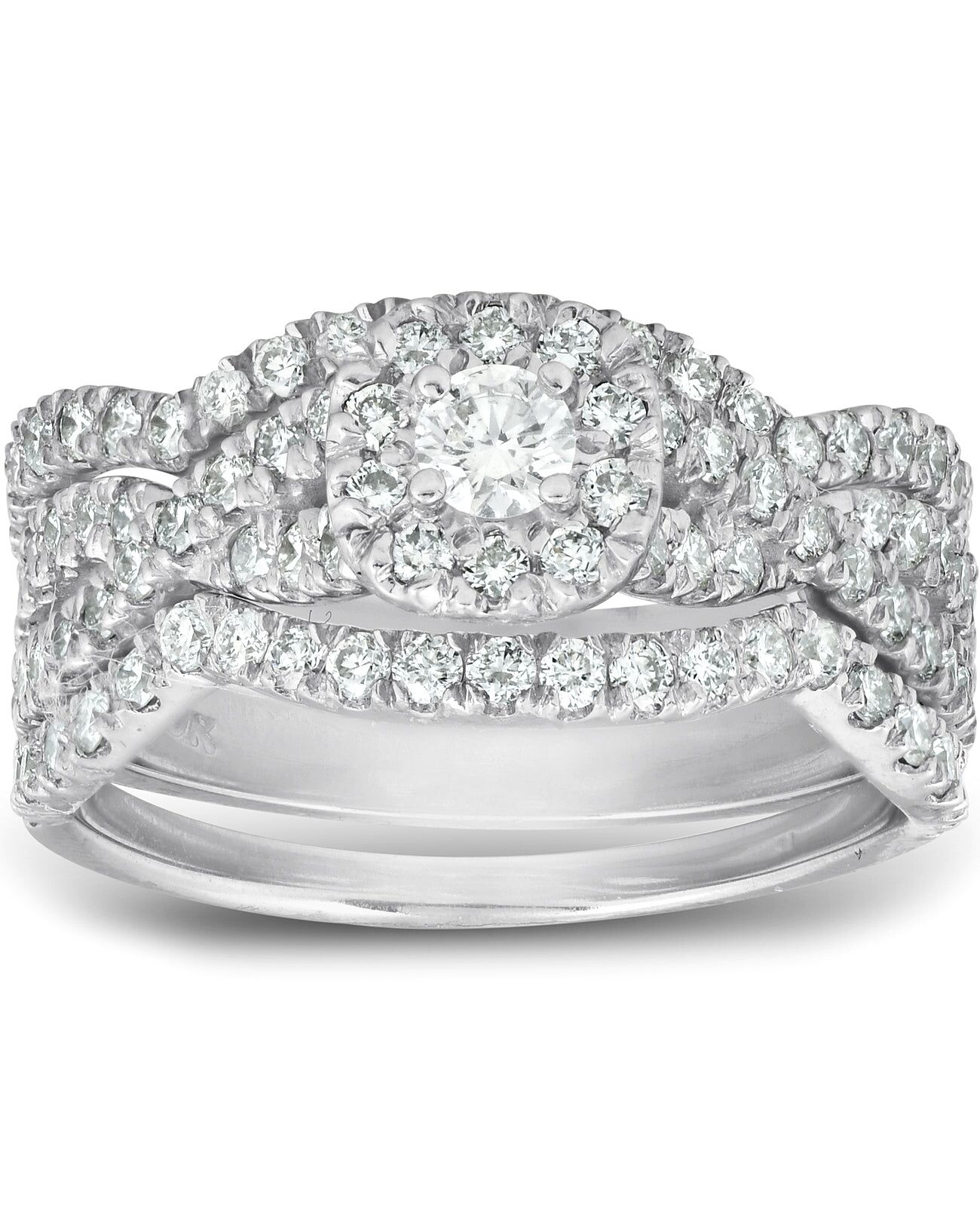 Womens quality diamond engagement wedding ring set features 97 round cut genuine diamonds. All diamonds are set in solid 10k white gold. This trio ring set features two matching bands that fit flush with the cushion halo engagement ring.