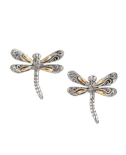 18k Gold and Silver Dragonfly Stud Earrings. Bring mystical style to any outfit with lovely two-tone dragonfly earrings. Hand made in bali- 18" solid gold accent lay over sterling silver