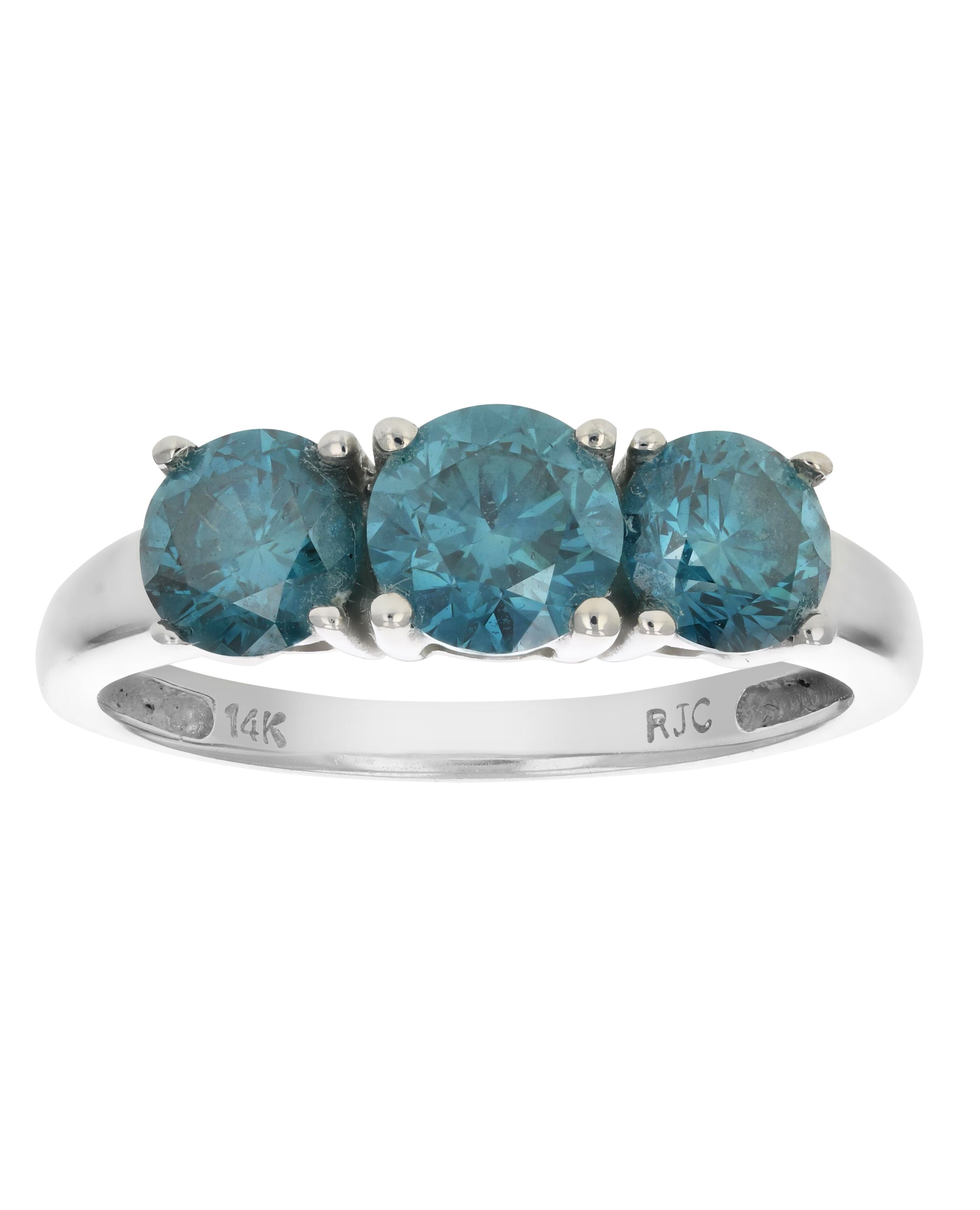 Ships within 1 dayExquisite, elegant 2 cttw 3 stone blue diamond engagement ring in 14k white gold. The 3 sparkling natural round blue diamonds are irradiated and set in a prong setting. This ring represents past, present and future. It is available in multiple sizes. Gift box is included with purchase of this ring.Stone Type - Natural Blue DiamondMetal - 14K White GoldDiamond Carat Weight - 2 cttwDiamond Cut - RoundDiamond Color - BlueDiamond Clarity - I1-I2Diamonds - 3Vir Jewels 14K White Gold Engagement Ring For Female AdultNatural diamonds are treated by irradiation to produce a variety of fancy colors including hues of blue. This process is permanent and does not alter any other property of the diamond except the color.Birthstone Month - April