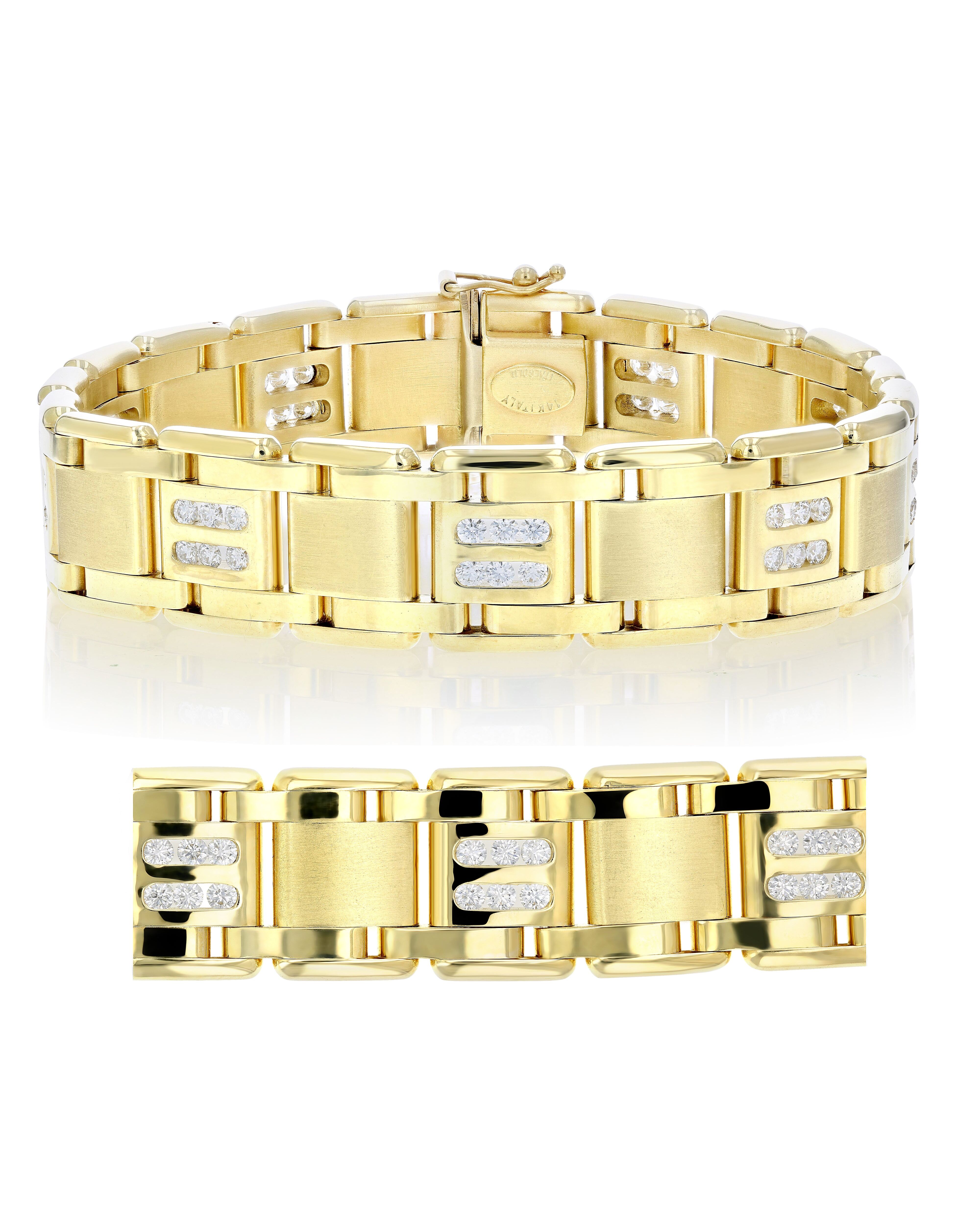 Ships within 1 dayPretty, this 2.60 cttw men's diamond bracelet in Italian 14k yellow gold illuminates his wrist like no other. The 54 natural round diamonds are G-H color and VS2-SI1 clarity and set in channel setting. The 8 inch 54 grams bracelet is secured by a box and tongue safety clasp. A gift box is included with this bracelet.Stone Type - Natural DiamondMetal - Italian 14K Yellow GoldNumber of Diamonds - 54Diamond Cut - RoundTotal Diamond Carat Weight - 2.60 cttwDiamond Clarity - VS2-SI1Metal Weight - 54 GramsBracelet Length - 8 InchesBirthstone Month - AprilVir Jewels 14K Yellow Gold Bracelet For Male Adult