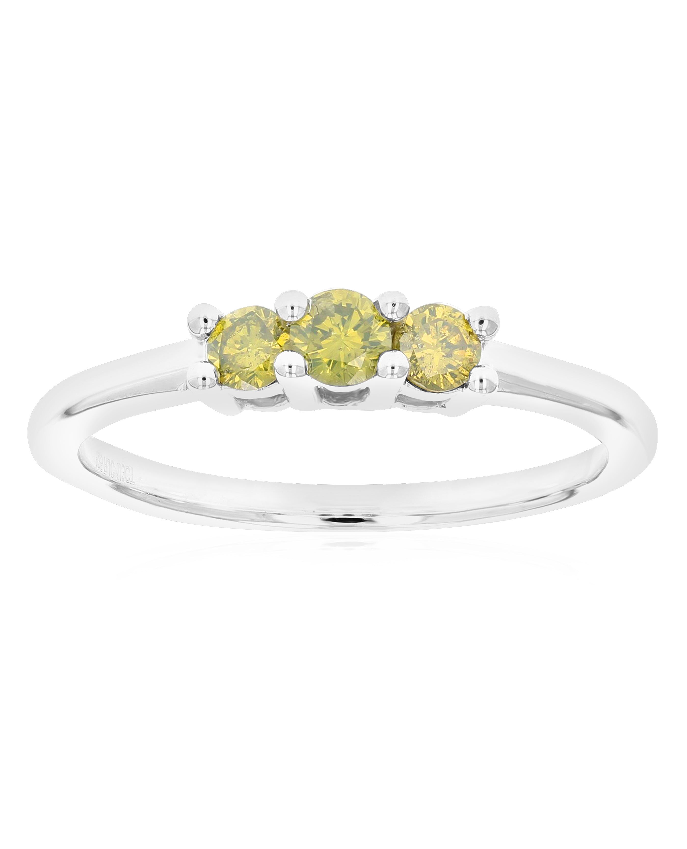 Ships within 1 dayLovely, uniquely designed, 3/8 cttw classic yellow diamond engagement ring in .925 sterling silver. The sparkling 3 round natural yellow diamonds are irradiated and set in a prong setting. The width is 3 MM (1/10 Inch). The ring is available in multiple sizes. Gift box is included with purchase of this ring.Stone Type - Natural Yellow DiamondMetal - .925 Sterling SilverDiamond Carat Weight - 3/8 cttwDiamond Cut - RoundDiamond Color - H-IDiamond Clarity - SI1-SI2Setting - ProngNumber of Diamonds - 3Natural diamonds are treated by irradiation to produce a variety of fancy colors including hues of yellow. This process is permanent and does not alter any other property of the diamond except the color.Birthstone Month - April