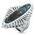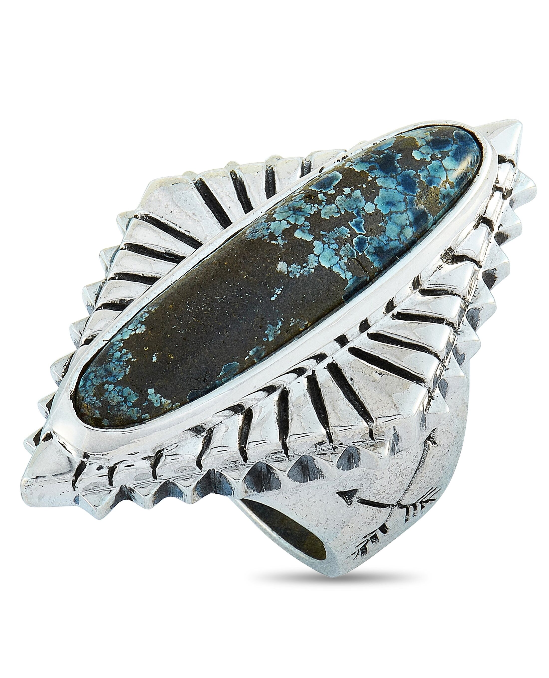 The King Baby “Concho” ring is crafted from silver and set with a spotted turquoise. The ring weighs 44.6 grams and boasts band thickness of 7 mm and top height of 9 mm, while top dimensions measure 30 by 41 mm.This item is offered in brand new condition and includes the manufacturer’s box.