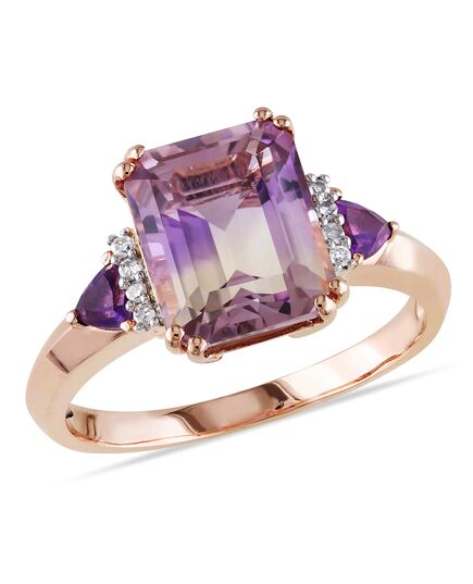 A beautiful gift to say "I love you", this dazzling Ametrine and Amethyst with Diamond Three-Stone Cocktail Ring is crafted in rose rhodium-plated sterling silver. This ring features an octagon-cut (10mm x 8mm) ametrine in the center and trilliant-cut (3mm) amethyst gemstones as side stones. This ring is also features 8 round-cut, prong-set diamond accents (G-H, I2-I3) shimmer along the sides. This ring is enhanced with a high polish finish.