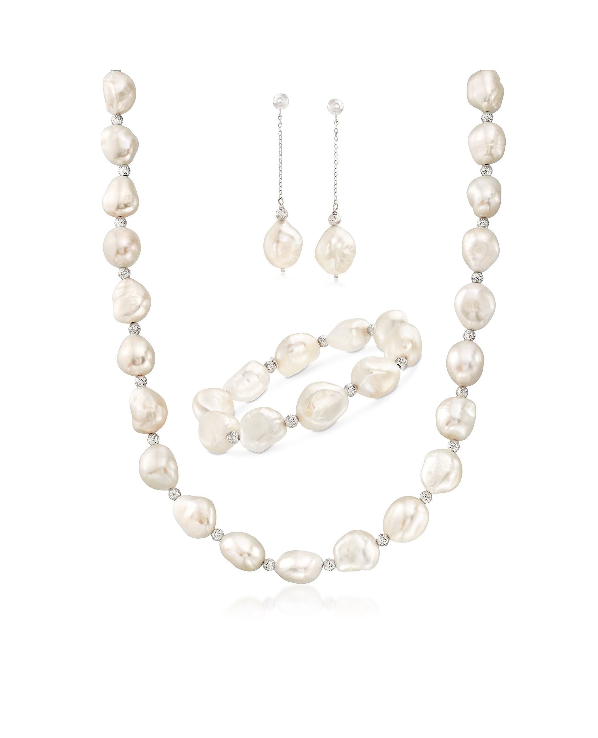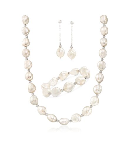 Ross-Simons is always looking for new ways to reinvent essential jewelry styles. Instant elegance. Effortlessly accessorize with this ready-to-glow jewelry set. Features 11-12mm cultured freshwater baroque pearls with diamond-cut and polished sterling silver fixtures and beads. Includes an 18" necklace with a lobster clasp, 7" stretch bracelet, and post/clutch earrings with 2" hanging length. White pearl jewelry set. Each Ross-Simons item arrives in a fine jewelry presentation box. Shop Ross-Simons jewelry risk-free as all items include a 30-day, 100% money-back guarantee.Pearl InformationPearl Type 1 - Freshwater-CulturedPearl Minimum Color 1 - WhitePearl Lustre 1 - Medium-LusterPearl Shape 1 - BaroquePearl Uniformity 1 - GoodPearl Surface Blemishes 1 - Moderately BlemishedPearl Stringing Method 1 - Moderately BlemishedSize Per Pearl 1 - 11-12mmNumber Of Pearls 1 - 37