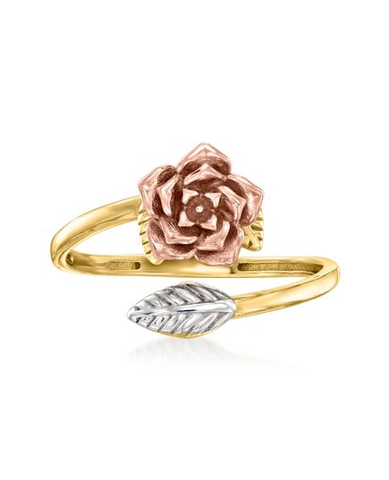 Established in 1952, Ross-Simons presents contemporary styles with a timeless appeal. Our enchanting rose ring is blossoming with decadent shimmer. Crafted in 14kt rose, yellow and white gold, a rich bloom and leaf are planted on a polished swirling band, wrapping the finger with luxury. 1/2" wide. 14kt tri-colored gold rose and leaf bypass ring. Each Ross-Simons item arrives in a fine jewelry presentation box. Shop Ross-Simons jewelry risk-free as all items include a 30-day, 100% money-back guarantee.