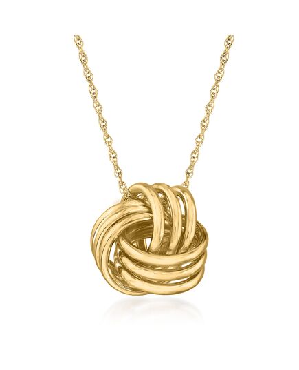 With a commitment to quality and affordability, Ross-Simons presents timeless jewelry for the modern woman. The timeless love knot motif is presented in this creative and classic 14kt yellow gold pendant necklace. The polished design suspends from a rope chain and finishes with a springring clasp. 14kt yellow gold love knot pendant necklace. Necklace drop length - 3/8 inch long. Necklace drop width - 3/8 inch wide. Each Ross-Simons item arrives in a fine jewelry presentation box. Shop Ross-Simons jewelry risk-free as all items include a 30-day, 100% money-back guarantee.