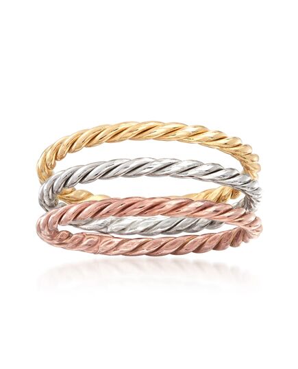 Ross-Simons is the authority on fashionable must-haves. Wear all together or switch it up between all three! This handcrafted, stackable ring set showcases a trio of roped bands. Set includes one of each - 18kt white gold, 18kt yellow gold, and 18kt rose gold. 3/16" wide when worn all together. 18kt tri-colored gold ring set. Each Ross-Simons item arrives in a fine jewelry presentation box. Shop Ross-Simons jewelry risk-free as all items include a 30-day, 100% money-back guarantee.