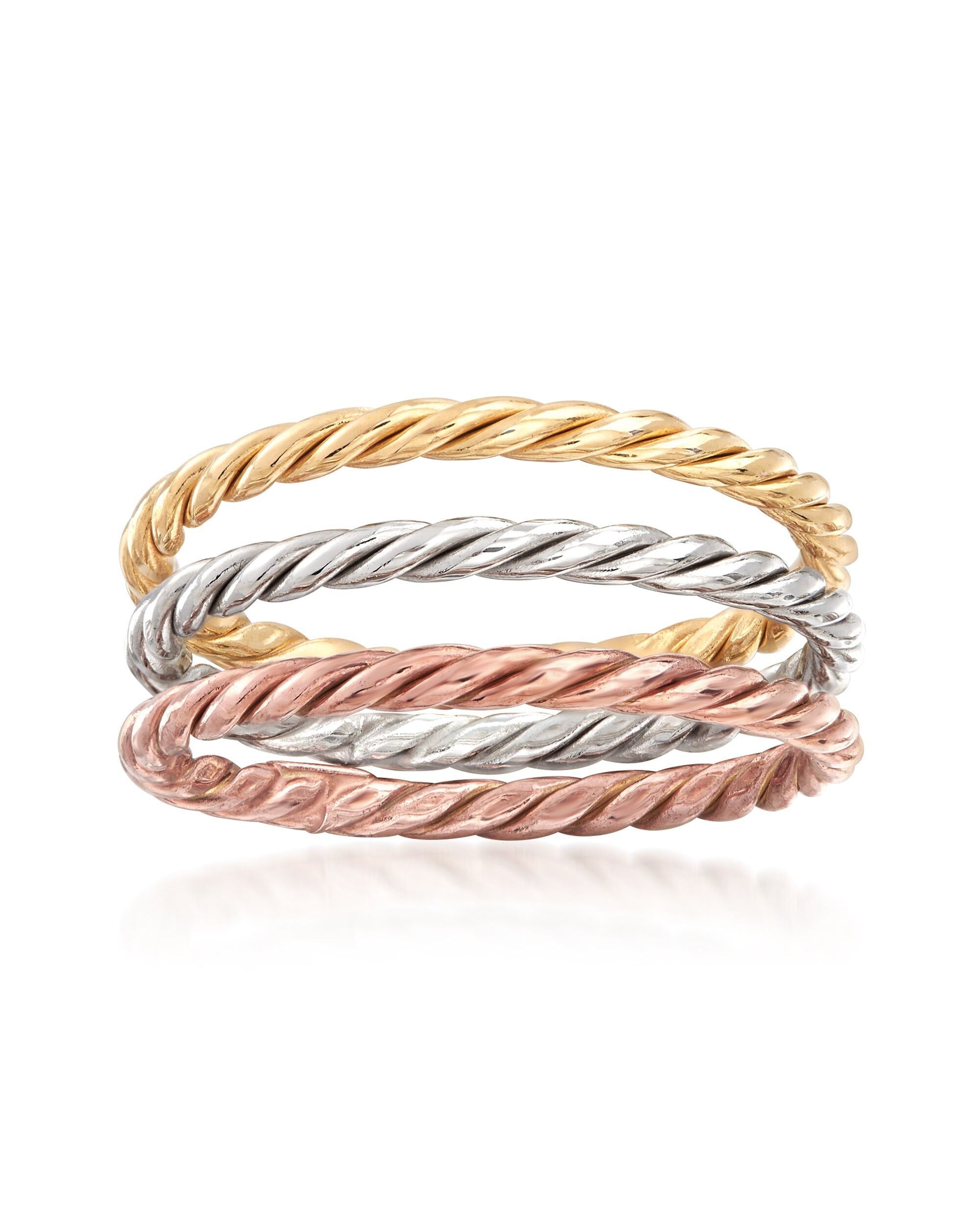 Ross-Simons is the authority on fashionable must-haves. Wear all together or switch it up between all three! This handcrafted, stackable ring set showcases a trio of roped bands. Set includes one of each - 18kt white gold, 18kt yellow gold, and 18kt rose gold. 3/16" wide when worn all together. 18kt tri-colored gold ring set. Each Ross-Simons item arrives in a fine jewelry presentation box. Shop Ross-Simons jewelry risk-free as all items include a 30-day, 100% money-back guarantee.