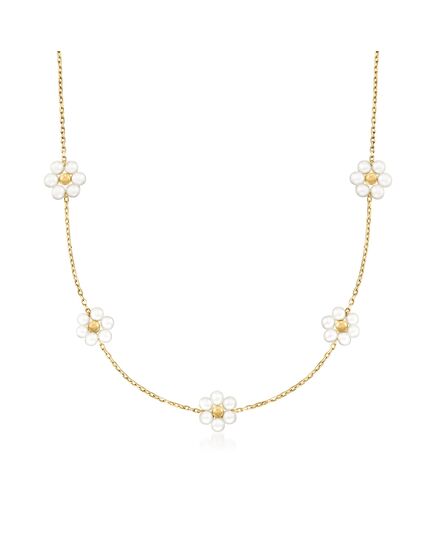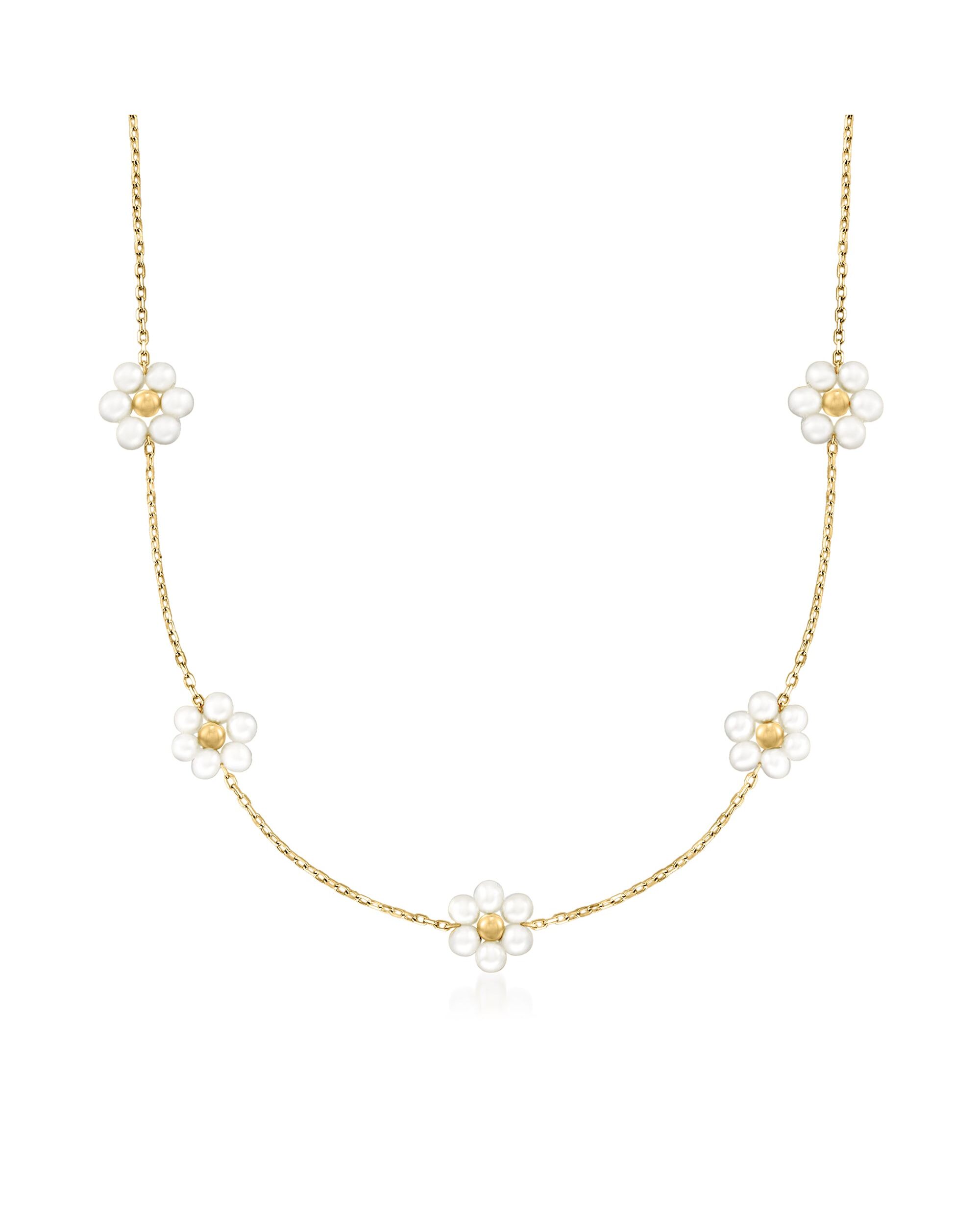 At Ross-Simons, we recognize the style power of versatile classics. These pretty florals are always in bloom! On this lovely necklace, 3-3.5mm cultured freshwater pearls create five floral stations along a dainty 14kt yellow gold cable chain with a 2" extender. Also features 3mm gleaming bead centerpieces for a luxe shine. Springring clasp, white pearl flower station necklace. Each Ross-Simons item arrives in a fine jewelry presentation box. Shop Ross-Simons jewelry risk-free as all items include a 30-day, 100% money-back guarantee.Pearl InformationPearl Type 1 - Freshwater-CulturedPearl Minimum Color 1 - Freshwater-CulturedPearl Lustre 1 - Medium-LusterPearl Shape 1 - Semi-RoundPearl Uniformity 1 - GoodPearl Surface Blemishes 1 - Moderately BlemishedPearl Stringing Method 1 - Moderately BlemishedSize Per Pearl 1 - 3-3.5mmNumber Of Pearls 1 - 30