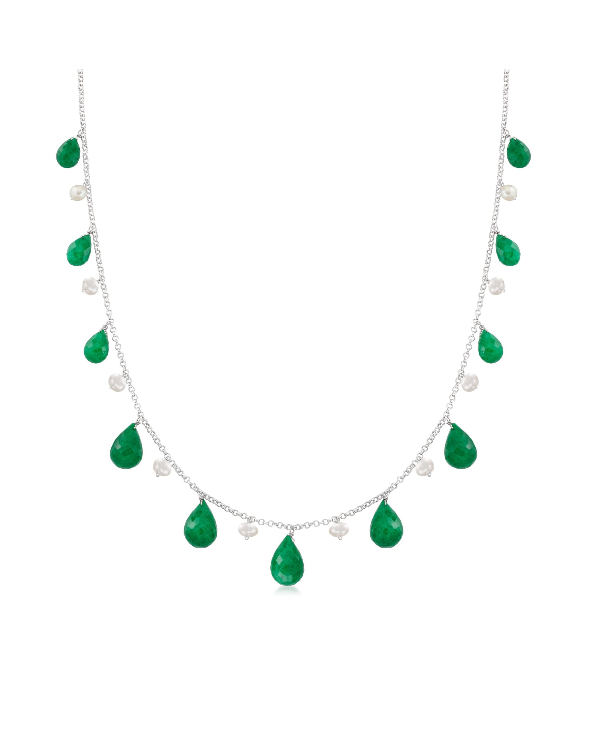 Ross-Simons 4-5mm Cultured Pearl and Emerald Bead Necklace in Sterling Silver