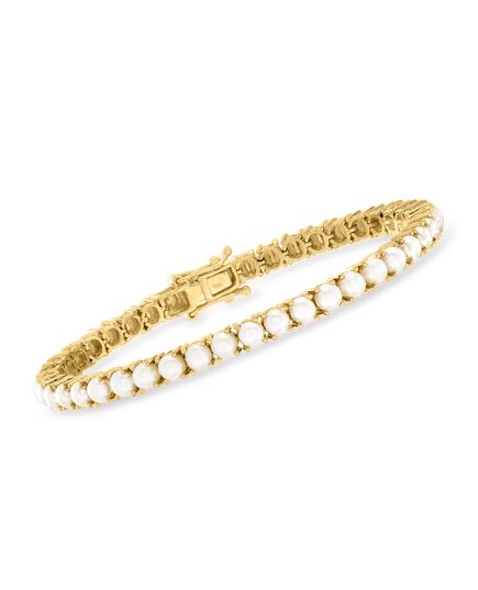 Ross-Simons presents contemporary styles with a timeless appeal. Luminous pearls are getting in on the classic tennis design! On this sleek and slender bracelet, 4mm cultured freshwater button pearls gleam side by side in polished 18kt yellow gold over sterling silver. Double-latch safety. Box clasp, white pearl tennis bracelet. Each Ross-Simons item arrives in a fine jewelry presentation box. Shop Ross-Simons jewelry risk-free as all items include a 30-day, 100% money-back guarantee.Pearl InformationPearl Type 1 - Freshwater-CulturedPearl Minimum Color 1 - Freshwater-CulturedPearl Lustre 1 - Medium-LusterPearl Shape 1 - ButtonPearl Uniformity 1 - GoodPearl Surface Blemishes 1 - Moderately BlemishedPearl Stringing Method 1 - Moderately BlemishedSize Per Pearl 1 - 4mmNumber Of Pearls 1 - 42