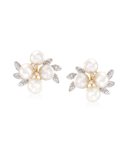 Ross-Simons 5.5-6mm Cultured Pearl Cluster Earrings With Diamond Accents in 14kt Yellow Gold