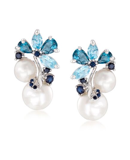 Ross-Simons 6-8.5mm Cultured Pearl and Sky Blue Topaz and London Blue Topaz Earrings With . Sapphires in Sterling Silver