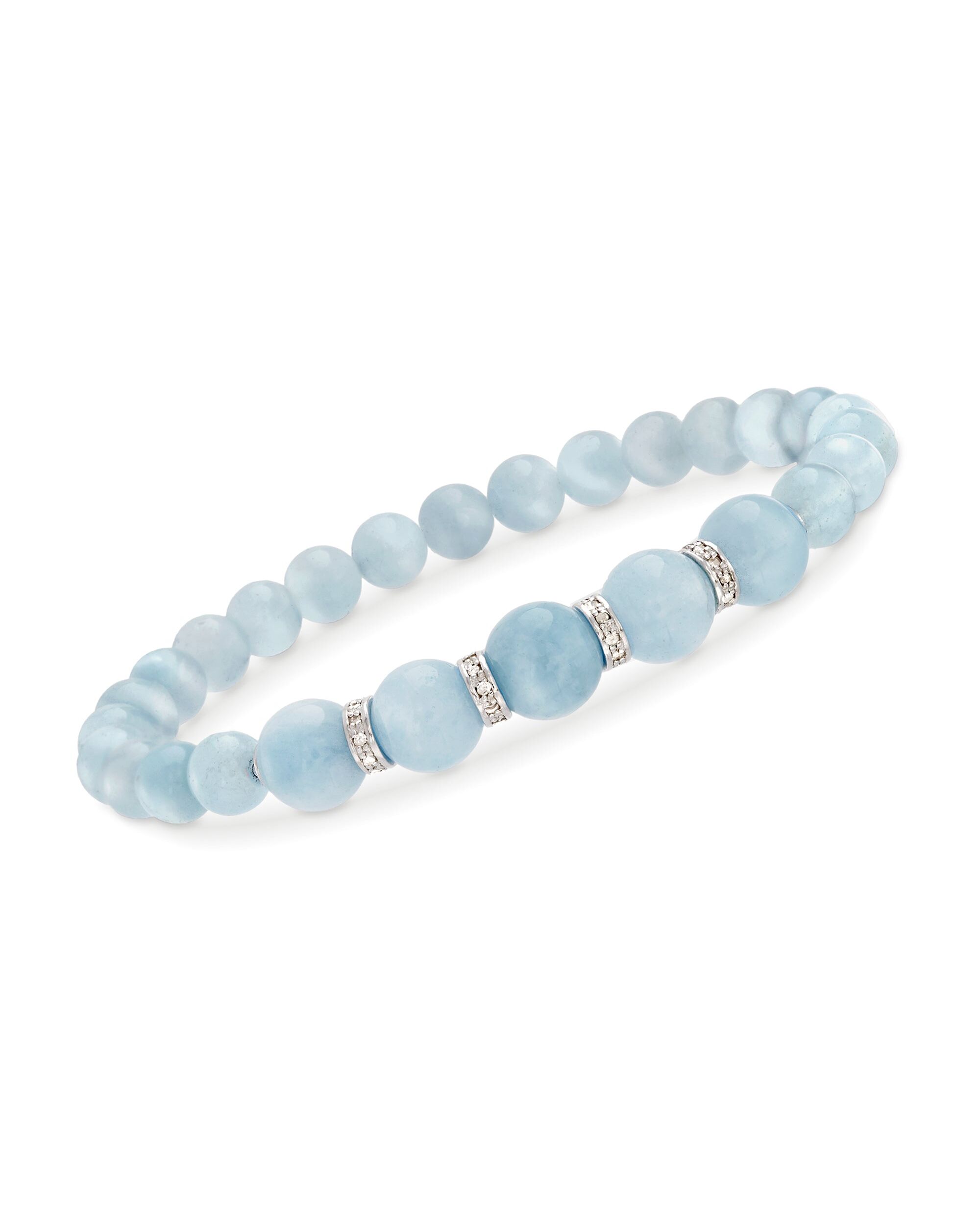 Ross-Simons presents contemporary styles with a timeless appeal. The cool glow of 50.00 ct. t.w. milky aquamarine beads becomes even more lovely with .24 ct. t.w. diamond-studded spacers across the front of this chic graduated bead bracelet. Set in sterling silver. 1/4" wide. Stretches for easy wear. Diamond and aquamarine bead bracelet. Each Ross-Simons item arrives in a fine jewelry presentation box. Shop Ross-Simons jewelry risk-free as all items include a 30-day, 100% money-back guarantee.Stone InformationGem Type 1 - AquamarineStone Cut 1 - Good-CutStone Color 1 - BlueStone Clarity 1 - BlueStone Shape 1 - Round-ShapeStone Creation Method 1 - NaturalStone Treatment Method 1 - Heat-TreatedStone Weight 1 - 30.00-40.00 CaratsNumber Of Stones 1 - 22-26Gem Type 2 - AquamarineStone Cut 2 - Good-CutStone Color 2 - BlueStone Clarity 2 - BlueStone Shape 2 - Round-ShapeStone Creation Method 2 - NaturalStone Treatment Method 2 - Heat-TreatedStone Weight 2 - 20.00 CaratsNumber Of Stones 2 - 5Gem Type 3 - DiamondStone Cut 3 - Good-CutStone Color 3 - H-IStone Clarity 3 - I3Stone Shape 3 - Round-ShapeStone Creation Method 3 - NaturalStone Treatment Method 3 - Not-TreatedStone Weight 3 - 0.24 CaratsNumber Of Stones 3 - 40