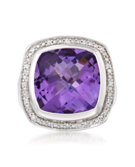 Ross-Simons presents contemporary styles with a timeless appeal. Sizzling and stylish, our 9.10 carat amethyst and .10 ct. t.w. diamond ring makes a sophisticated statement that's sure to stir up some cocktail chatter. Finely crafted in polished sterling silver. 3/4" wide. Diamond and amethyst ring. Each Ross-Simons item arrives in a fine jewelry presentation box. Shop Ross-Simons jewelry risk-free as all items include a 30-day, 100% money-back guarantee.Stone InformationGem Type 1 - AmethystStone Cut 1 - Good-CutStone Color 1 - Violet-BlueStone Clarity 1 - Violet-BlueStone Shape 1 - Special-Cut-ShapeStone Creation Method 1 - NaturalStone Treatment Method 1 - Heat-TreatedStone Weight 1 - 9.10 CaratsNumber Of Stones 1 - 1Gem Type 2 - DiamondStone Cut 2 - Good-CutStone Color 2 - H-IStone Clarity 2 - SI2Stone Shape 2 - Round-ShapeStone Creation Method 2 - NaturalStone Treatment Method 2 - Not-TreatedStone Weight 2 - 0.10 CaratsNumber Of Stones 2 - 16