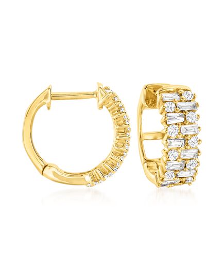 Ross-Simons Baguette and Round Diamond Hoop Earrings in 14kt Yellow Gold