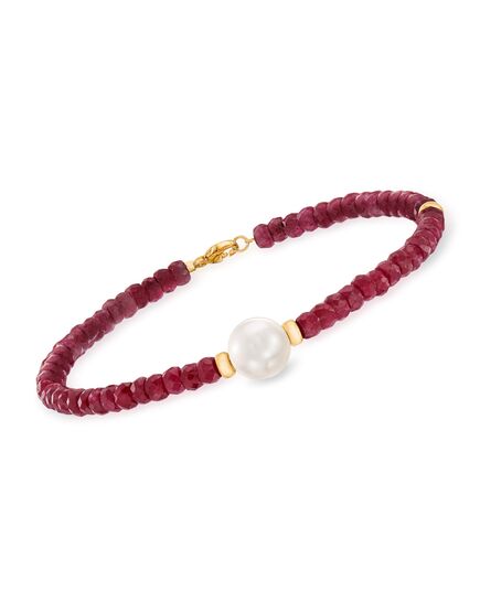 Ross-Simons Beaded Ruby Bracelet With 10mm Cultured Pearl in 14kt Yellow Gold