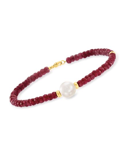 Ross-Simons Beaded Ruby Bracelet With 10mm Cultured Pearl in 14kt Yellow Gold