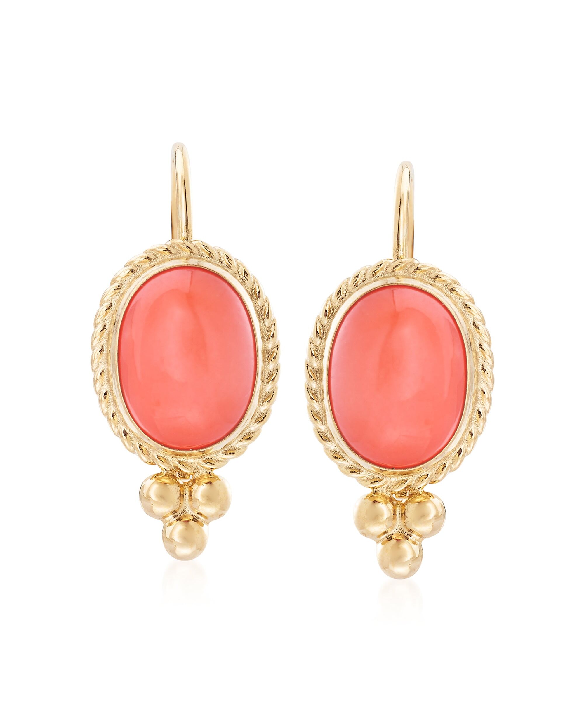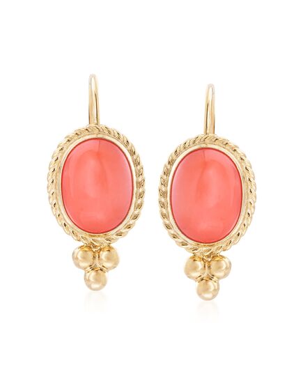 Established in 1952, Ross-Simons presents contemporary styles with a timeless appeal. A simple pop of color will instantly brighten your look. Accented with a trio of tiny bead accents, these earrings boast a hot shade of orange coral within roped bezels of polished 14kt yellow gold. Hanging length is 3/4". Leverback, coral drop earrings. Each Ross-Simons item arrives in a fine jewelry presentation box. Shop Ross-Simons jewelry risk-free as all items include a 30-day, 100% money-back guarantee.Stone InformationGem Type 1 - CoralStone Cut 1 - CabochonStone Color 1 - OrangeStone Clarity 1 - OrangeStone Shape 1 - Oval-ShapeStone Creation Method 1 - NaturalStone Treatment Method 1 - Dyed, ImpregnatedStone Weight 1 - 0.00 CaratsNumber Of Stones 1 - 2