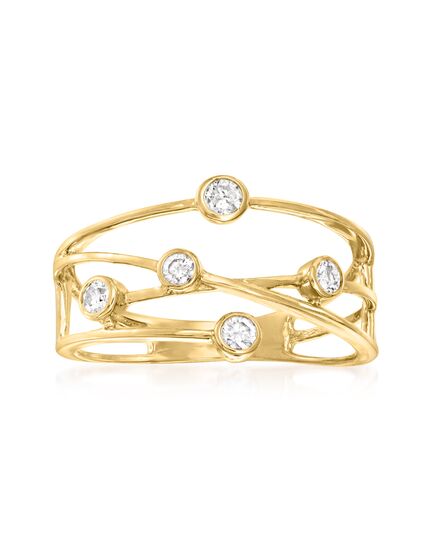 Ross-Simons presents contemporary styles with a timeless appeal. Five diamond bezels go every which way in this dynamic crisscross ring. Displays 0.25 ct. t.w. round brilliant-cut diamonds in polished 14kt yellow gold. 3/8" wide. Diamond crisscross ring. Each Ross-Simons item arrives in a fine jewelry presentation box. Shop Ross-Simons jewelry risk-free as all items include a 30-day, 100% money-back guarantee.Stone InformationGem Type 1 - DiamondStone Cut 1 - Good-CutStone Color 1 - I-JStone Clarity 1 - I1Stone Shape 1 - Round-ShapeStone Creation Method 1 - NaturalStone Treatment Method 1 - Not-TreatedStone Weight 1 - 0.25 CaratsNumber Of Stones 1 - 5