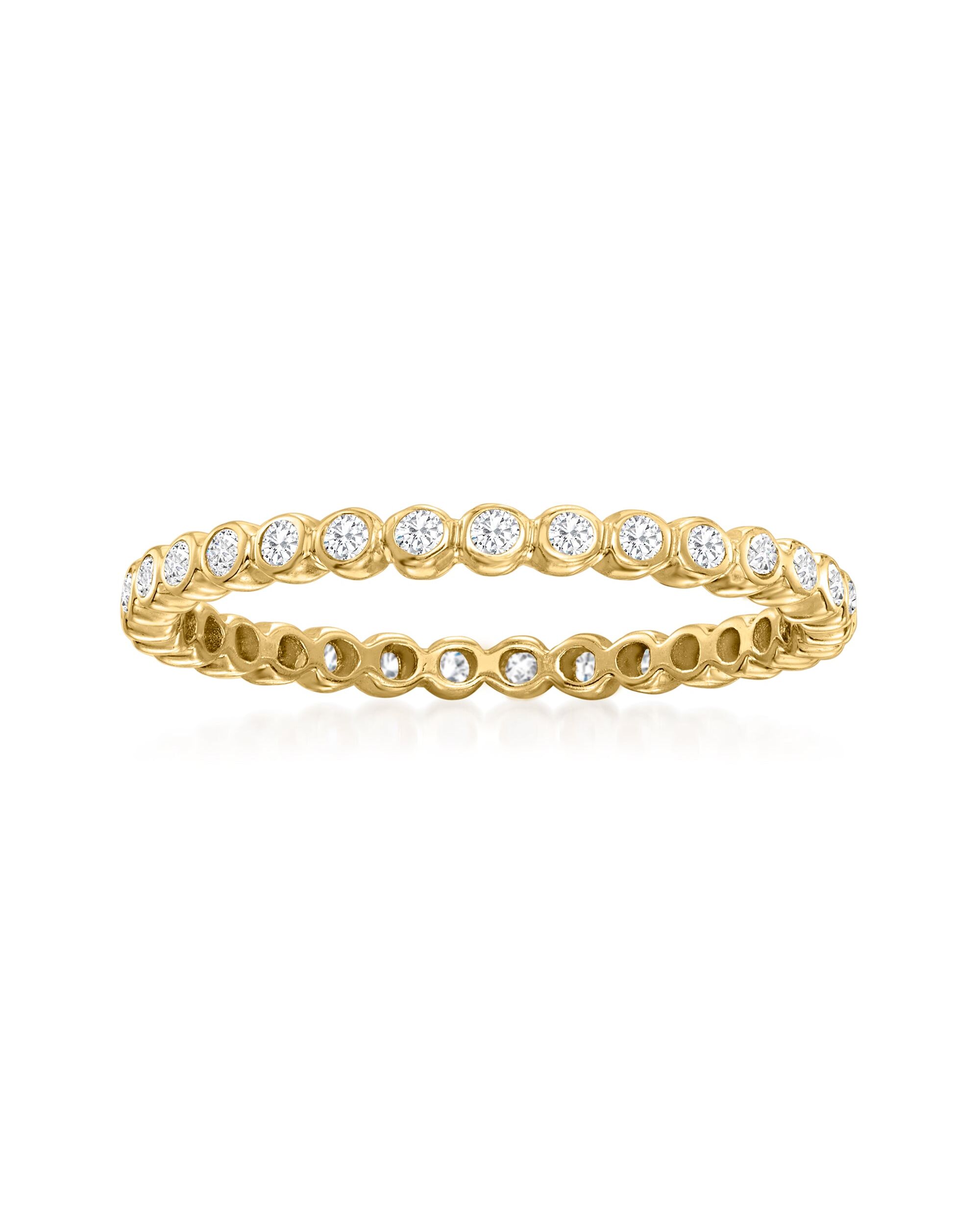 A top-rated jeweler since 1952, Ross-Simons travels the world to find high-quality styles at the best prices. Eternally beautiful, this eternity band ring shows off 0.25 ct. t.w. round brilliant-cut diamonds in bezel settings. Crafted in polished 14kt yellow gold. 1/16" wide. Diamond eternity band. Each Ross-Simons item arrives in a fine jewelry presentation box. Shop Ross-Simons jewelry risk-free as all items include a 30-day, 100% money-back guarantee.Stone InformationGem Type 1 - DiamondStone Cut 1 - Good-CutStone Color 1 - I-JStone Clarity 1 - I2Stone Shape 1 - Round-ShapeStone Creation Method 1 - NaturalStone Treatment Method 1 - Not-TreatedStone Weight 1 - 0.25 CaratsNumber Of Stones 1 - 23-29