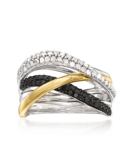 Ross-Simons Black and White Diamond Highway Ring in Sterling Silver and 14kt Yellow Gold